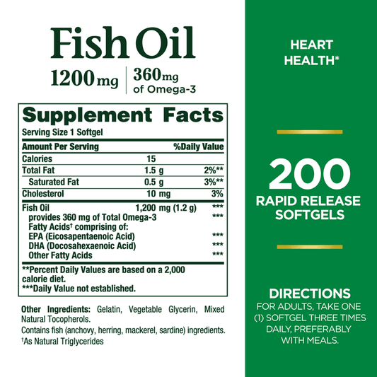Nature's Bounty Fish Oil 1200 mg | Supports Heart Health | 360 mg Omega-3 | 200 Rapid Release Softgels; Exp 06/2026