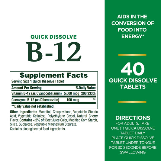 Nature's Bounty Vitamin B12 5000mcg (Cyanocobalamin) | Supports Energy Metabolism and Nervous System Health | 40 Quick Dissolve Tablets; Exp❗️Unclear 05/2026 👉🏽See last picture