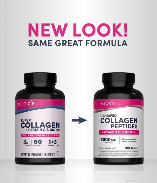 NeoCell Grassfed Collagen + Vitamin C + Biotin | Formerly Super Collagen | For Glowing Skin | 180 tablets; Exp 06/2028 (New Look)
