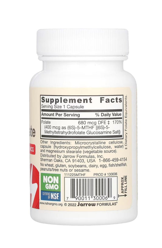 Jarrow Formulas Extra Strength Methyl Folate 400 mcg | Cardiovascular and Neurologic Health Support | Methylfolate | 60 Capsules; Exp 06/2028