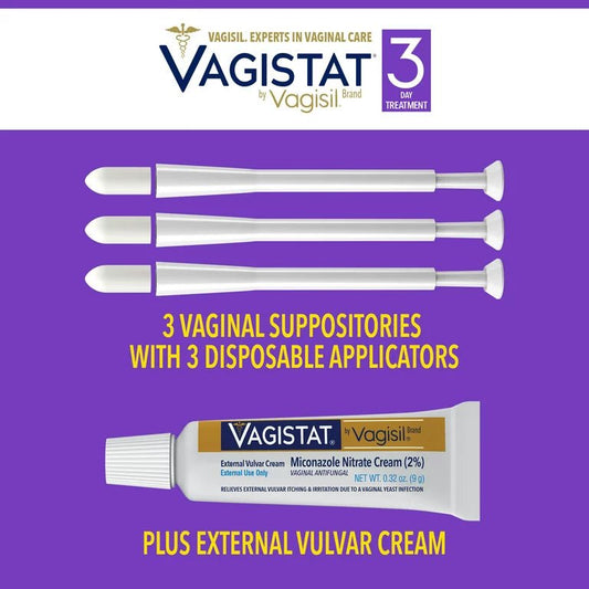 Vagistat by Vagisil 3-Day Vaginal Antifungal Yeast Infection Treatment Cream, Miconazole Nitrate Combination Pack | Similar to Monistat | 3 Suppositories with 3 Applicators plus External Vulva Cream; Exp 01/2026