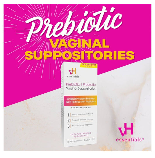 vH essentials Prebiotic + Probiotic Vaginal Suppositories | New Improved Formula with Vitamin E and Hyaluronic Acid | 15 Suppositories; Exp 10/2026