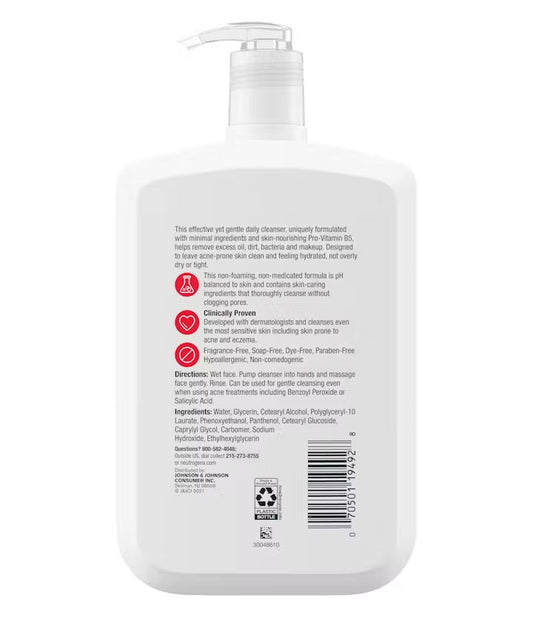 Neutrogena Ultra Gentle Daily Facial Cleanser with Pro-Vitamin B5 for Acne-Prone & Sensitive Skin, Fragrance-Free Hypoallergenic Face Wash, 16oz/473ml
