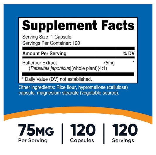Nutricost Butterbur Extract 75mg | A.k.a Coltsfoot | Free of Pyrrolizidine Alkaloids | Reduces Frequency of Migraines & Relieves Symptoms of Allergic Rhinitis | 120 Capsules; Exp 04/2027