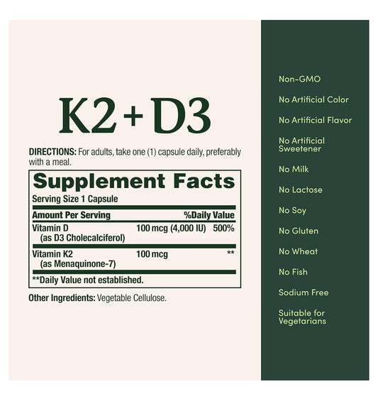 Nature’s Bounty Vitamin K2 + D3 | 4000 IU Vit D3 + 100 mcg Vit K2 | Supports Healthy Artery Function & Strong Bones | 30 Capsules; Exp 12/2026