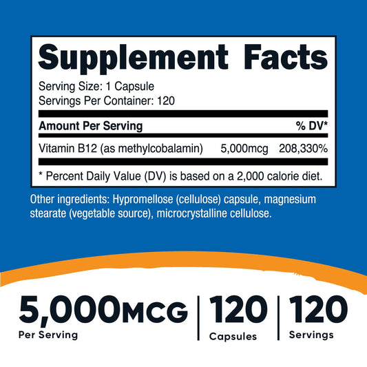 Nutricost Vitamin B12 (Methylcobalamin) 5000mcg | 120 Day Supply | Improves Mood | Supports Healthy Skin and Nails | 120 Capsules; Exp 08/2027