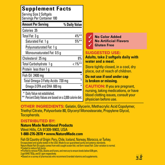 Nature Made Burp-Less Fish Oil 1200mg | Omega 3 Fish Oil for Healthy Heart Support | 200 Coated Softgels; Exp 2/2028
