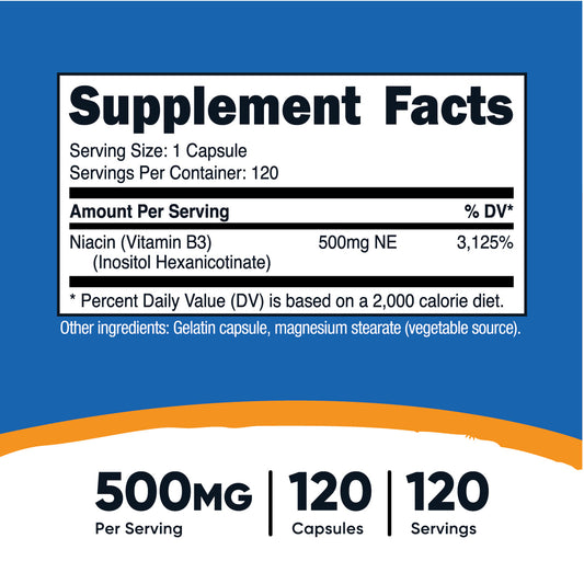 Nutricost Flush-Free Niacin 500mg (Vitamin B3) Inositol Hexanicotinate | Supports Nervous System & Energy Production | For Energy Metabolism | 120 Capsules; Exp 08/2027