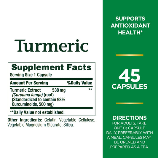 Nature's Bounty Turmeric 538mg Turmeric Curcumin | Antioxidant Support | 45 Capsules; Exp 02/2026