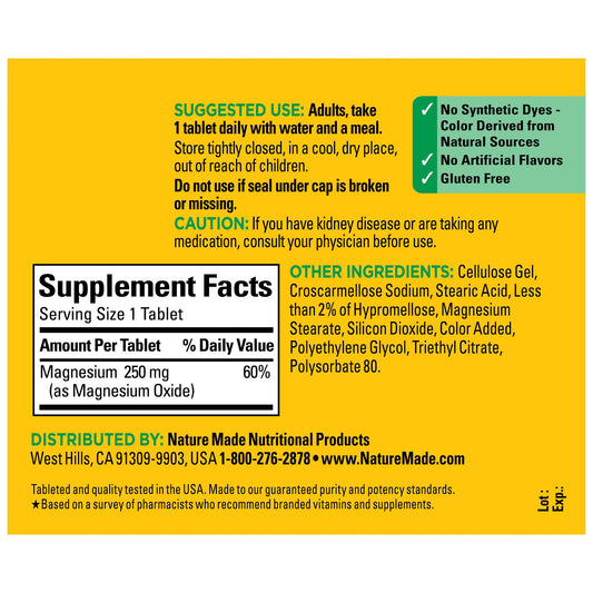 Nature Made Magnesium 250mg | 200 Day Supply | Magnesium Oxide | For Muscle, Heart, Bone and Nerve Support | 200 Tablets; Exp 01/2027