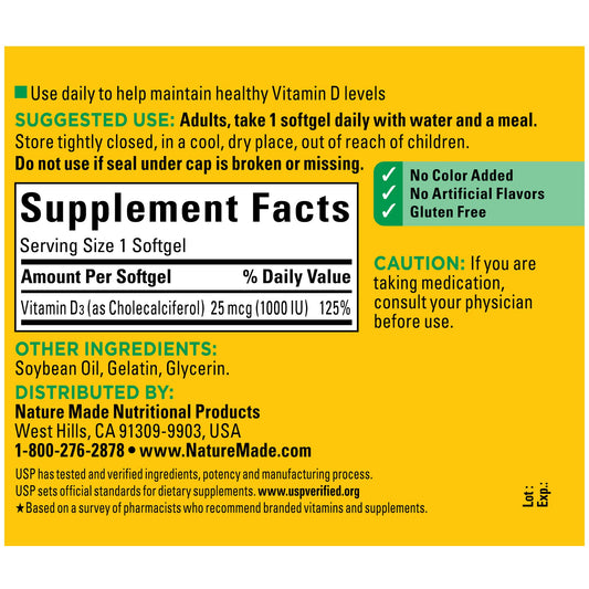 Nature Made Vitamin D3 1000 IU (25 mcg) | Supports Bone, Teeth, Muscle, Hormone and Immune Health | 180 Day Supply | 180 Softgels; Exp 01/2027
