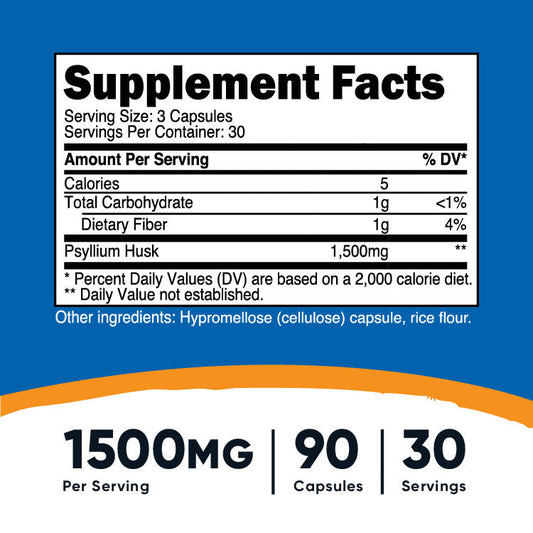 Nutricost Psyllium Husk Capsules 1500mg | 500mg per Capsule | Promotes Digestive Health | Promotes Bowel Regularity | 90 Capsules; Exp 08/2027