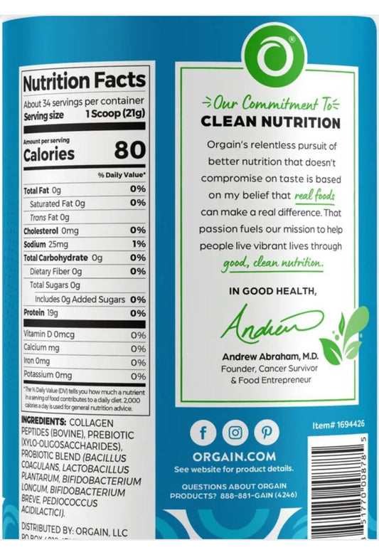Orgain Collagen Peptides 20g Powder with Probiotics 1 Billion CFU (5 Strains) and Prebiotics | Hair, Skin, Nail, Joint & Gut Support | 34 Servings | Unflavored, 1.6lbs/776g; Exp 05/2026