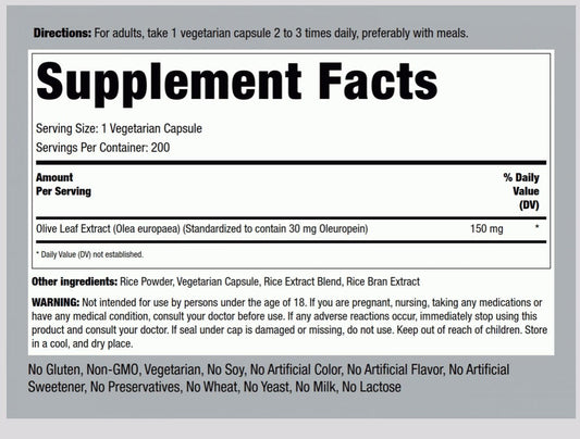 PipingRock Olive Leaf Extract 30mg Oleuropein | 200 Vegetarian Capsules; Exp 04/2026