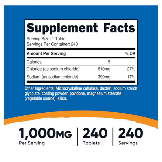 Nutricost Sodium Chloride 1000mg | Salt Tablets | Assists in Maintaining Optimal Hydration by Supporting Balanced Electrolyte Levels | 240 Tablets; Exp 12/2027