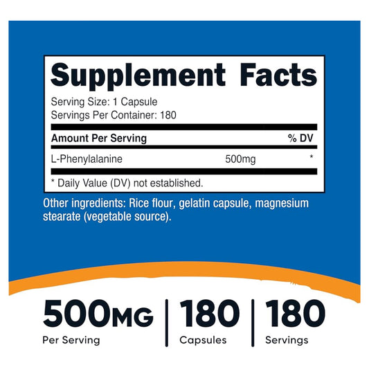 Nutricost L-Phenylalanine | Nervous System Support | Improves Mood & Decreases Stress Levels | Amino Acid | 180 Capsules; Exp 08/2027