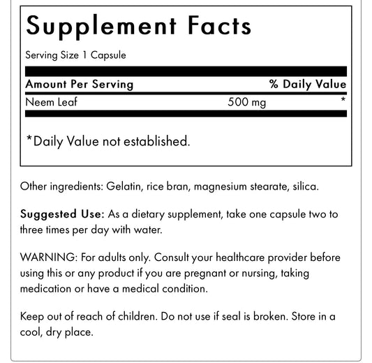 Swanson Neem Leaf 500mg - 100 Capsules; Exp 01/2027