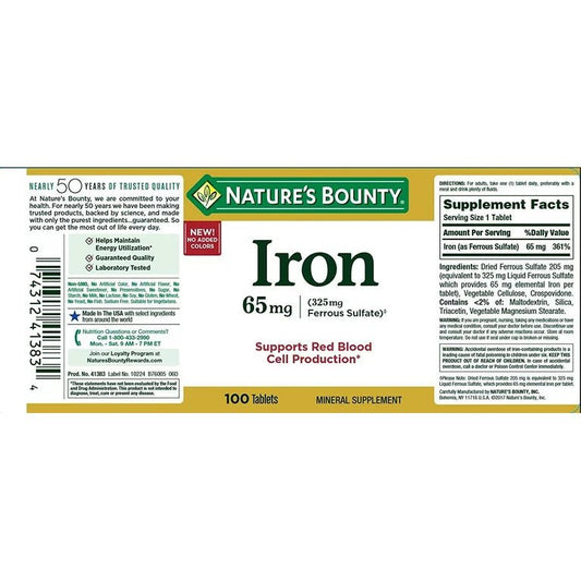 Nature’s Bounty Iron 65mg Ferrous Sulfate | Supports Red Blood Cell Production | 100 Tablets; Exp 02/2029