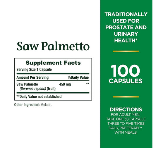 Nature's Bounty Saw Palmetto 450 mg | Prostate and Urinary Health | 100 Capsules; Exp 08/2026