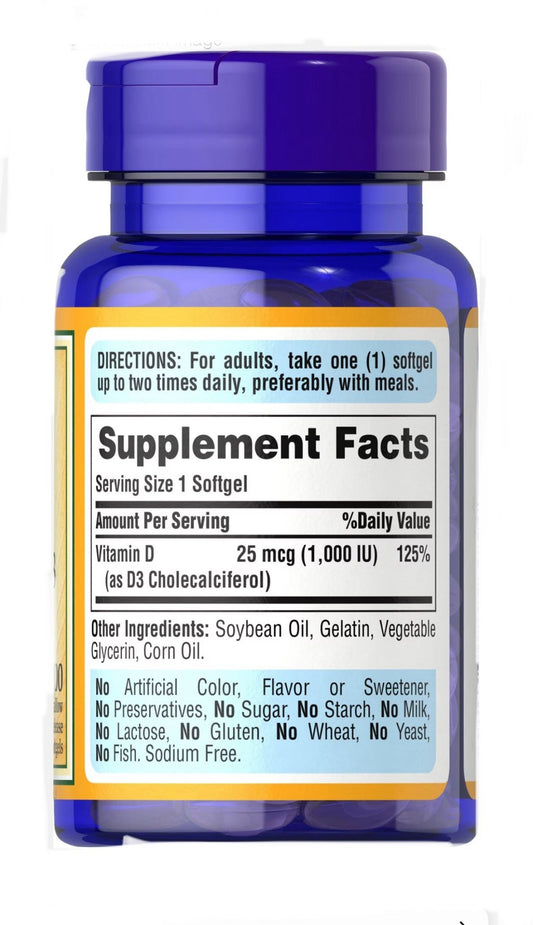 Puritan's Pride Vitamin D3 25 mcg (1000 IU) | 100 Softgels; Exp 05/2028