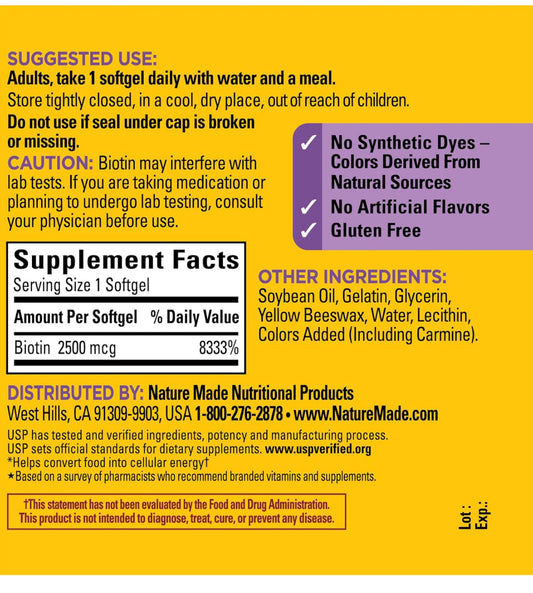 Nature Made Extra Strength Biotin 2500 mcg | 150 Day Supply | For Healthy Hair, Skin & Nail Support | 150 Softgels; Exp 02/2026