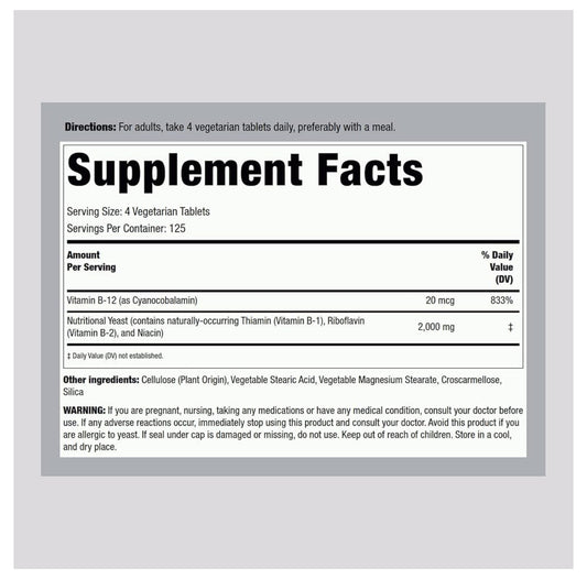 PipingRock Nutritional Yeast 2000mg Fortified with Vitamin B12 | Naturally Contains Thiamine (Vitamin B-1), Riboflavin (Vitamin B-2) & Niacin | 500 Tablets; Exp 08/2027