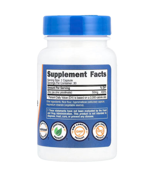 Nutricost Zinc Picolinate 50mg | Supports Hormone Health | Boosts Immune System | Extra Strength | 30 Capsules; Exp 07/2027