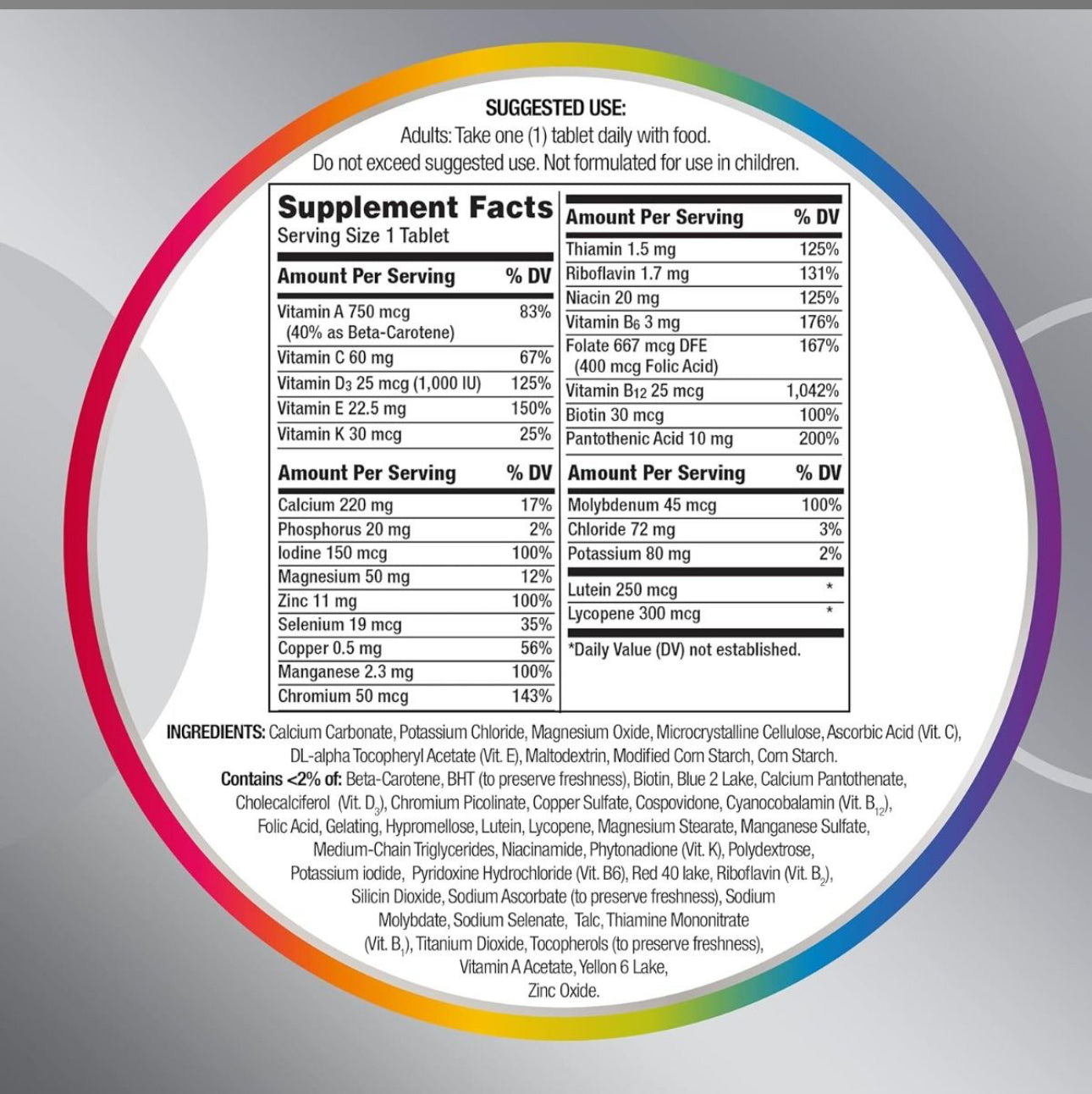 Centrum Silver Multivitamin Supplement for Adults 50 Plus brings you a tailored senior multivitamin/multimineral supplement to help support full body wellness. This adult vitamin contains essential nutrients, including Vitamin D and calcium to help support strong bones, B Vitamins to help promote heart health, zinc to help support normal brain function, and lutein and Vitamins A, C, and E to help support healthy eye. Key nutrients in this supplement help fill in nutritional gaps to promote overall wellness and vitality. This multivitamin for men and women is verified Non-GMO and gluten free to appeal to a variety of dietary preferences. These tablets feature a smooth coating that makes these adult vitamins easy to swallow. ย Help support full body wellness