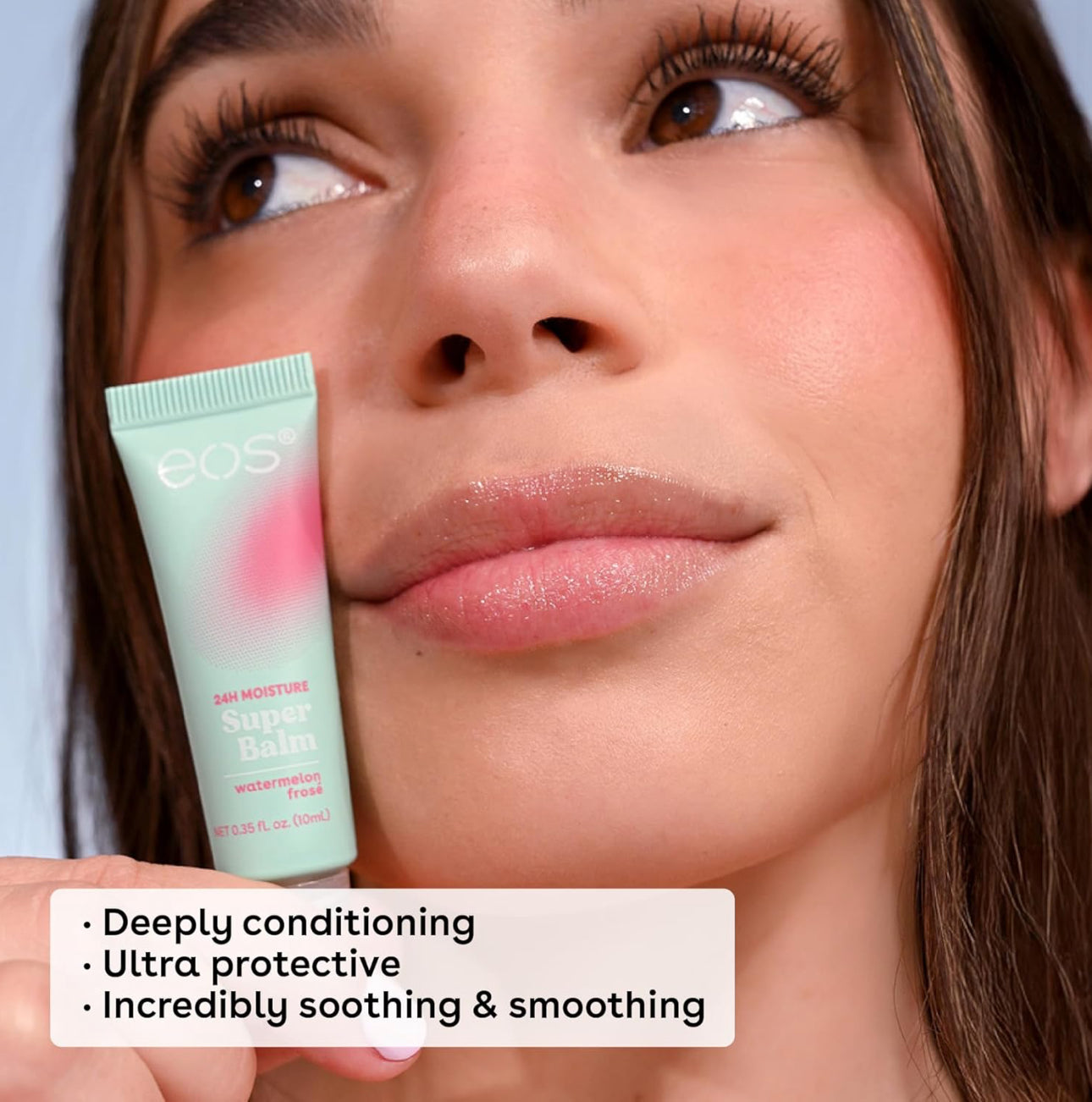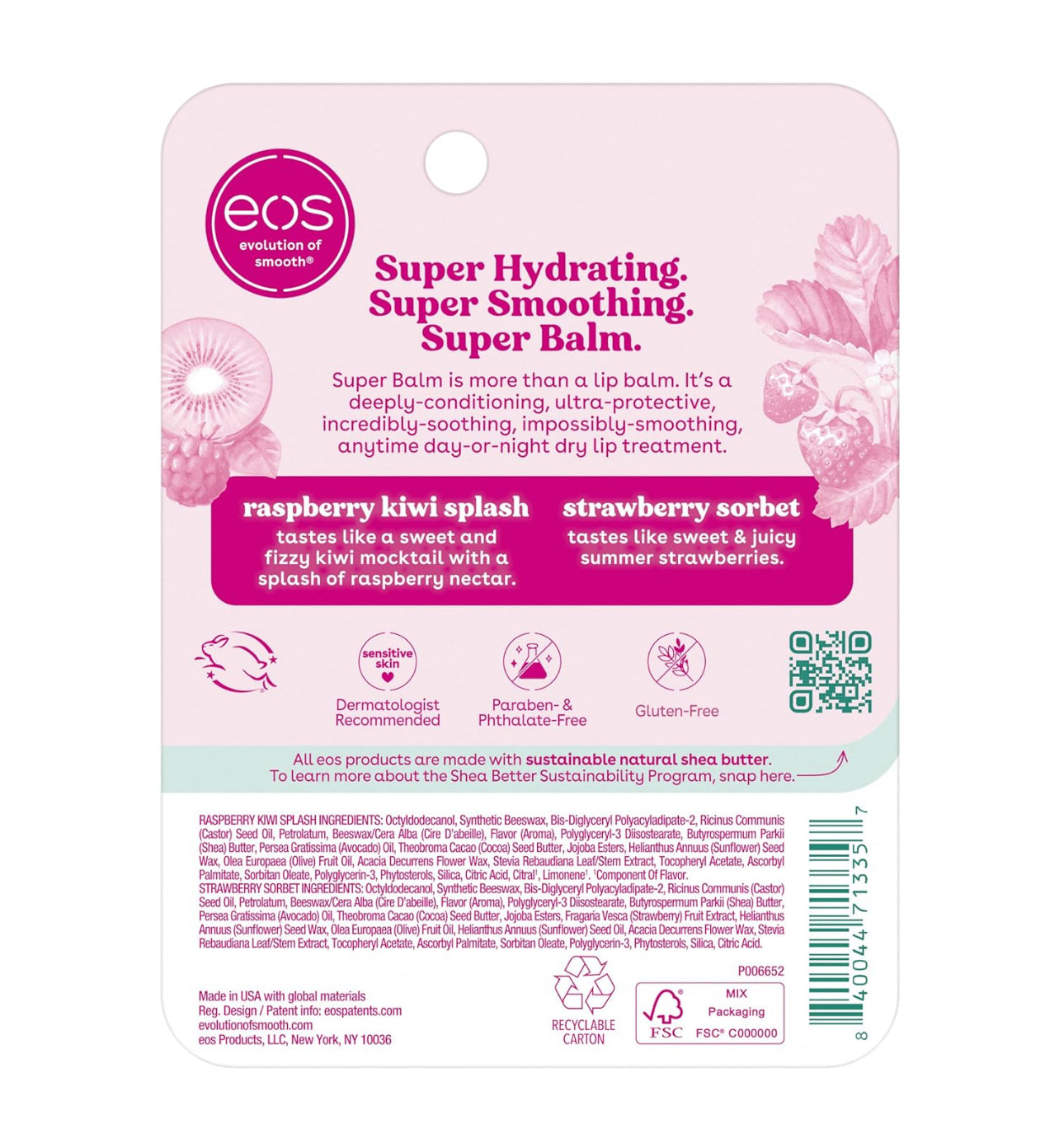 Our 24-hour moisture Super Balm is more than a lip balm. It’s a deeply-conditioning, ultra-protective, incredibly-soothing, anytime day-or-night dry lip treatment with a refreshing and fruity burst of raspberry kiwi splash and strawberry sorbet. This lip butter is dermatologist-recommended for sensitive skin and made with 3 hydrating butters: cocoa, shea, and avocado to leave your lips feeling super. Used as an overnight lip mask or a daily hydrating balm, it delivers continuous care for soft, nourished lips. A must-have in your everyday routine and skincare collection—designed to lock in moisture and keep hydration going strong. eos Moisture Super Balms are made with sustainably sourced ingredients and are hypoallergenic, cruelty-free, and free from parabens, phthalates, and gluten-free.