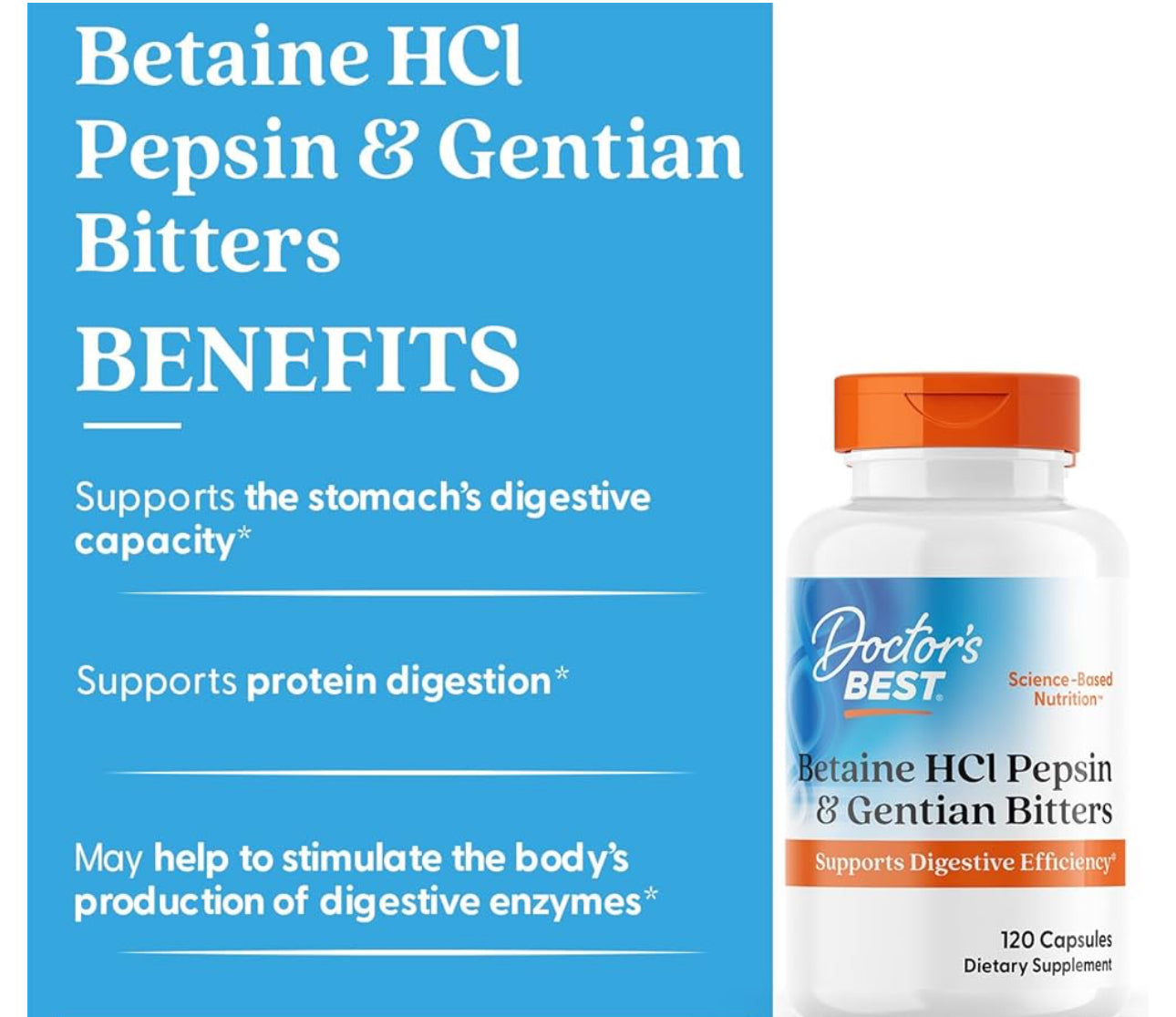 Doctor's Best Betaine HCl (hydrochloride) 650mg | with Pepsin & Gentian Bitters | Digestive Enzymes for Protein Breakdown & Absorption | 120 Capsules; Exp 06/2026 *New Look