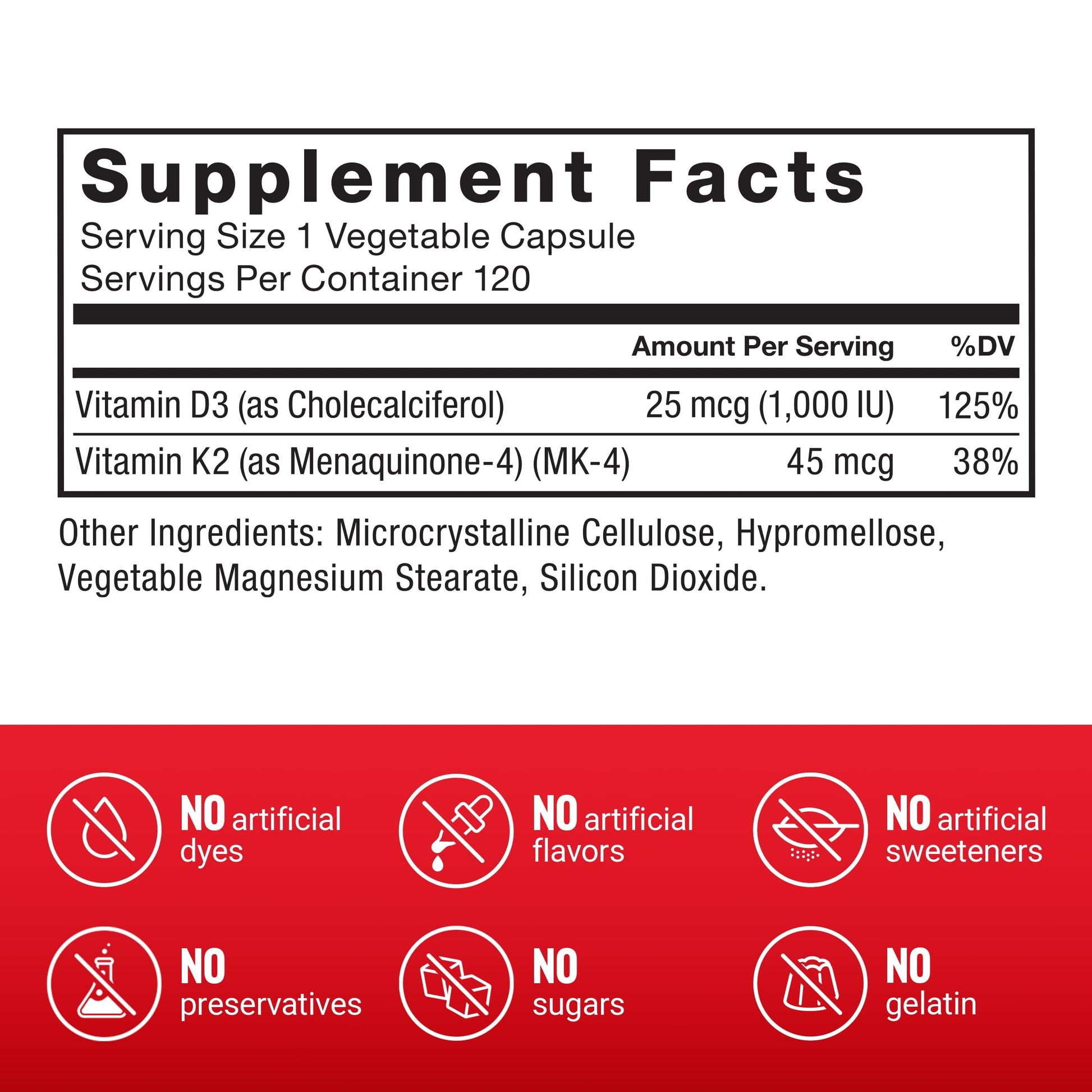 FORCE FACTOR Vitamin D3 25mcg (1000iu) & K2 45mcg (mk-4) | Enhances Immunity and Cardiovascular Function | Helps Maintain Strong and Healthy Bones | 120 Capsules; Exp 11/2027