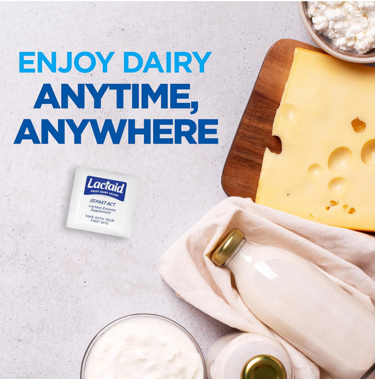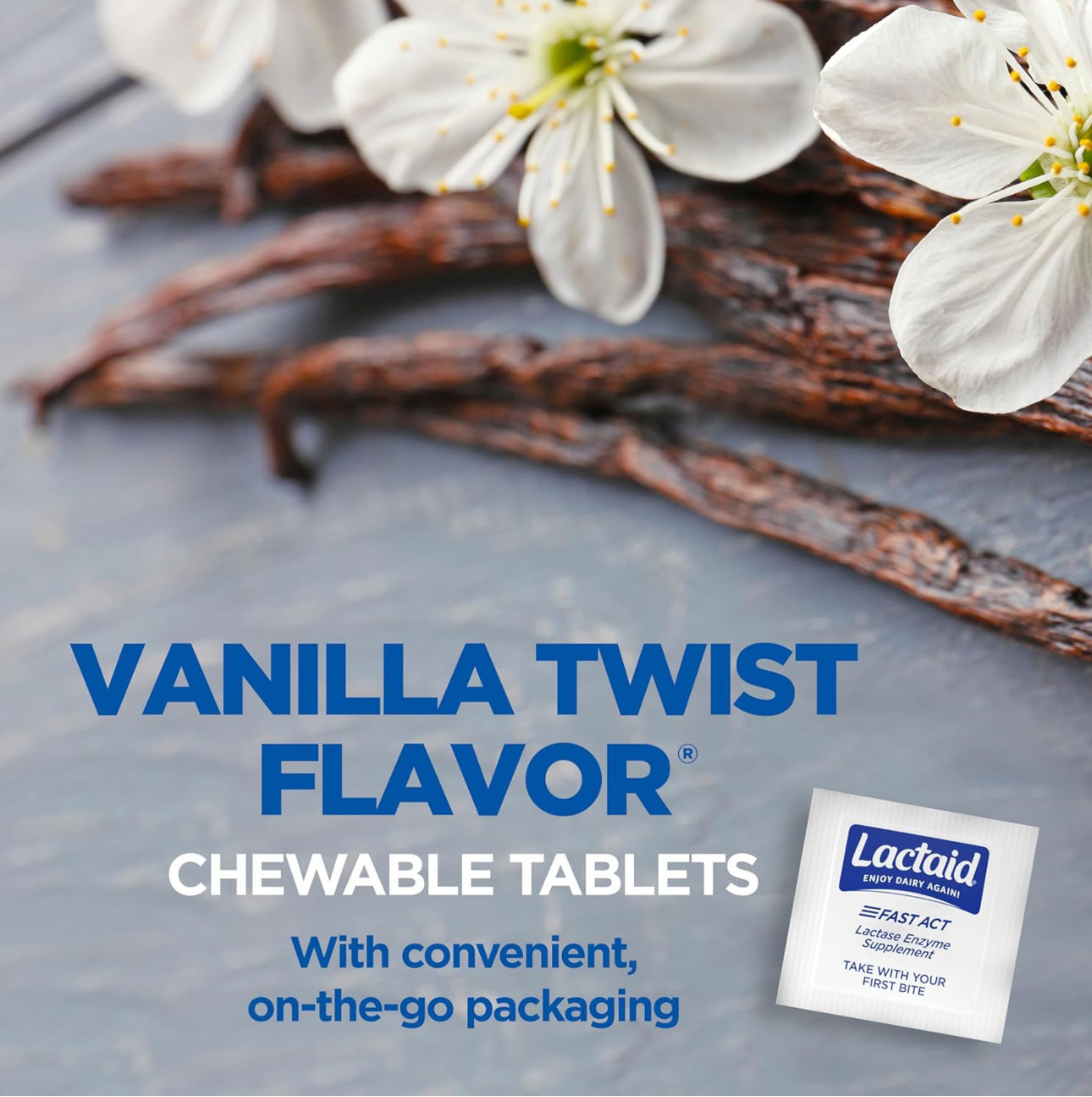 Lactaid Fast Act Chewables with natural lactase enzyme come in a Vanilla Twist flavor and work quickly to make dairy foods easy to digest for those with lactose intolerance or dairy sensitivity, so you can enjoy everything on your plate. This digestive supplement helps prevent the gas, bloating, and diarrhea that many people experience after eating foods containing dairy. The lactase enzymes in this dietary supplement contain 9000 FCC lactase units to help prevent symptoms associated with lactose intolerance by breaking down milk sugar (lactose), so dairy foods are easier to digest. These tasty chewables feature a smooth Vanilla Twist flavor and start working with your first bite or sip of dairy food. Certified kosher and suitable for ages 4 and up, Lactaid Fast Act Chewables are available inconvenient, individually-wrapped packs making them easily portable for on-the-go dairy relief anywhere, anytime.