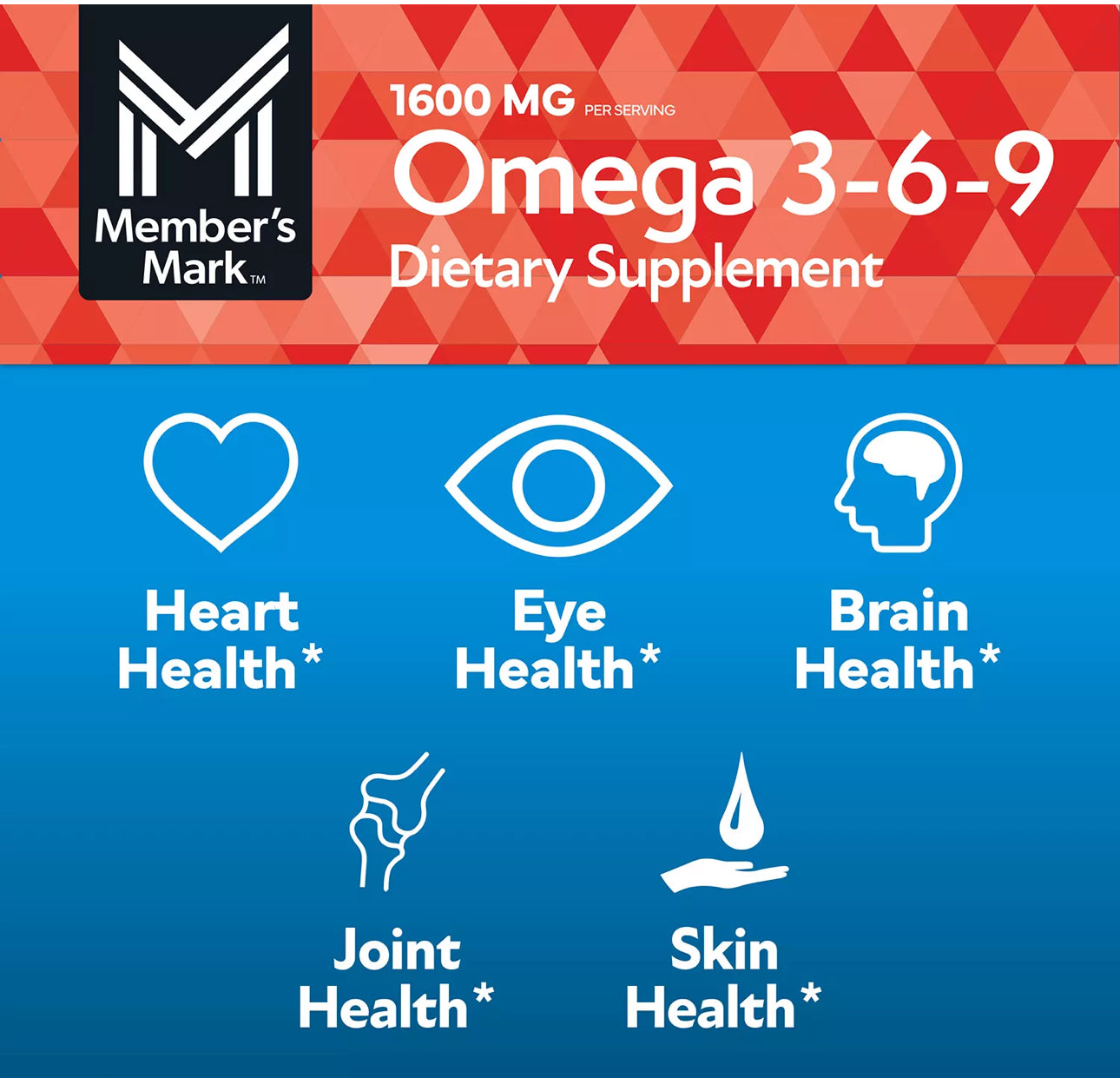 Member’s Mark™ Omega 3-6-9 Softgels are formulated with a unique blend of six nutrient-rich, natural source oils that deliver 1600 milligrams of essential fatty acids per serving. This product helps support your heart and cardiovascular health while promoting brain, muscle, skin, joint, immune, and eye health.