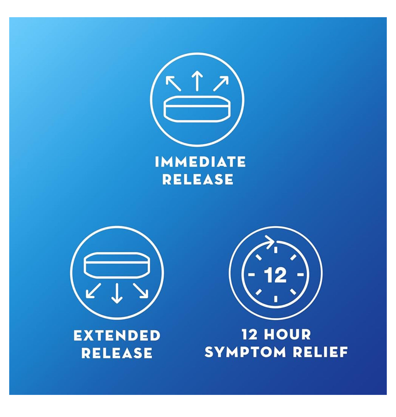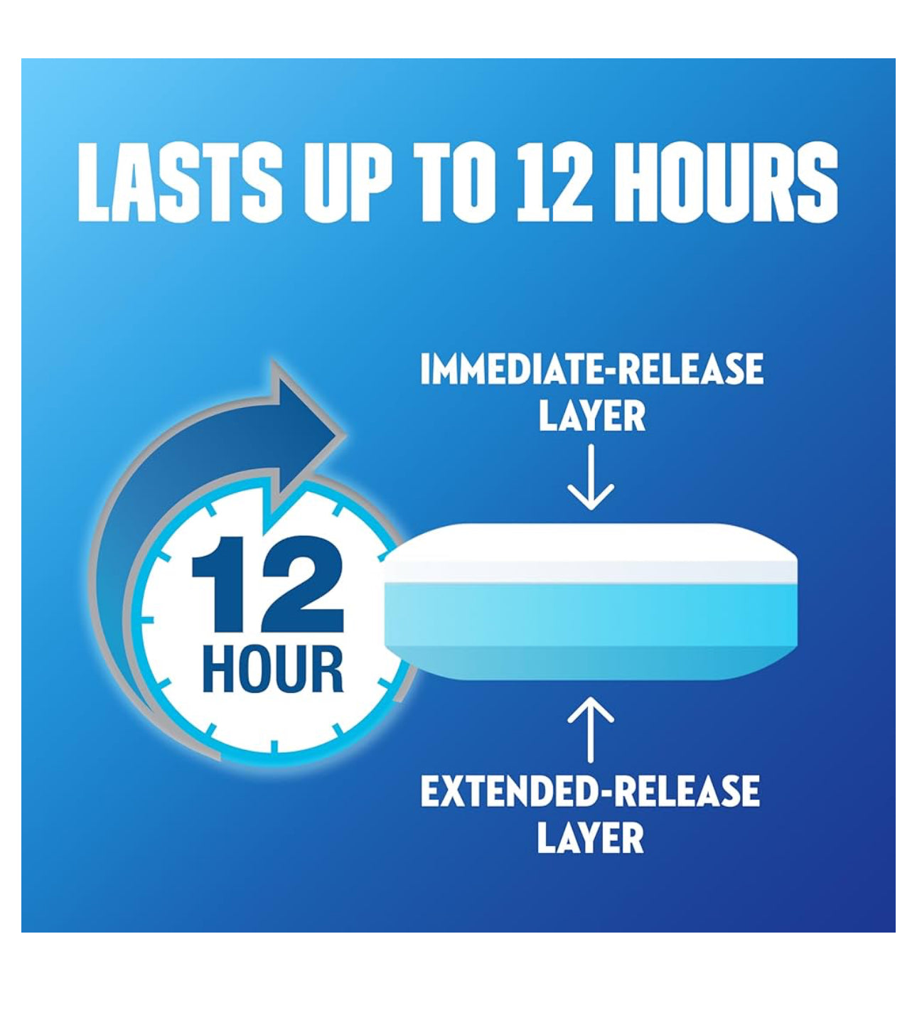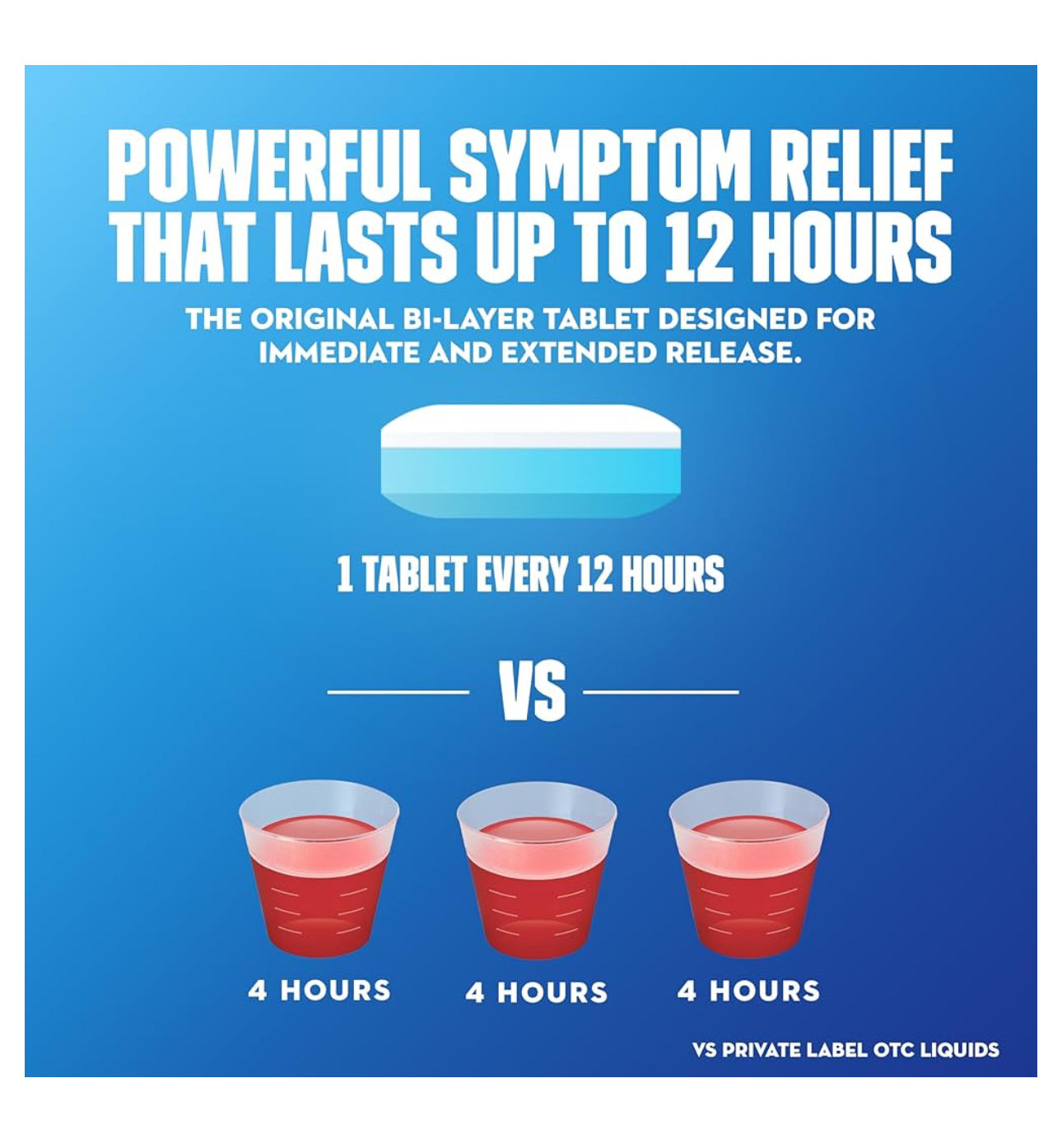 Only Mucinex has an extended release bi-layer tablet to deliver congestion relief. The first layer is absorbed quickly by your body for fast-acting relief. The other layer dissolves slowly to continue relieving your chest congestion for 12 hours.