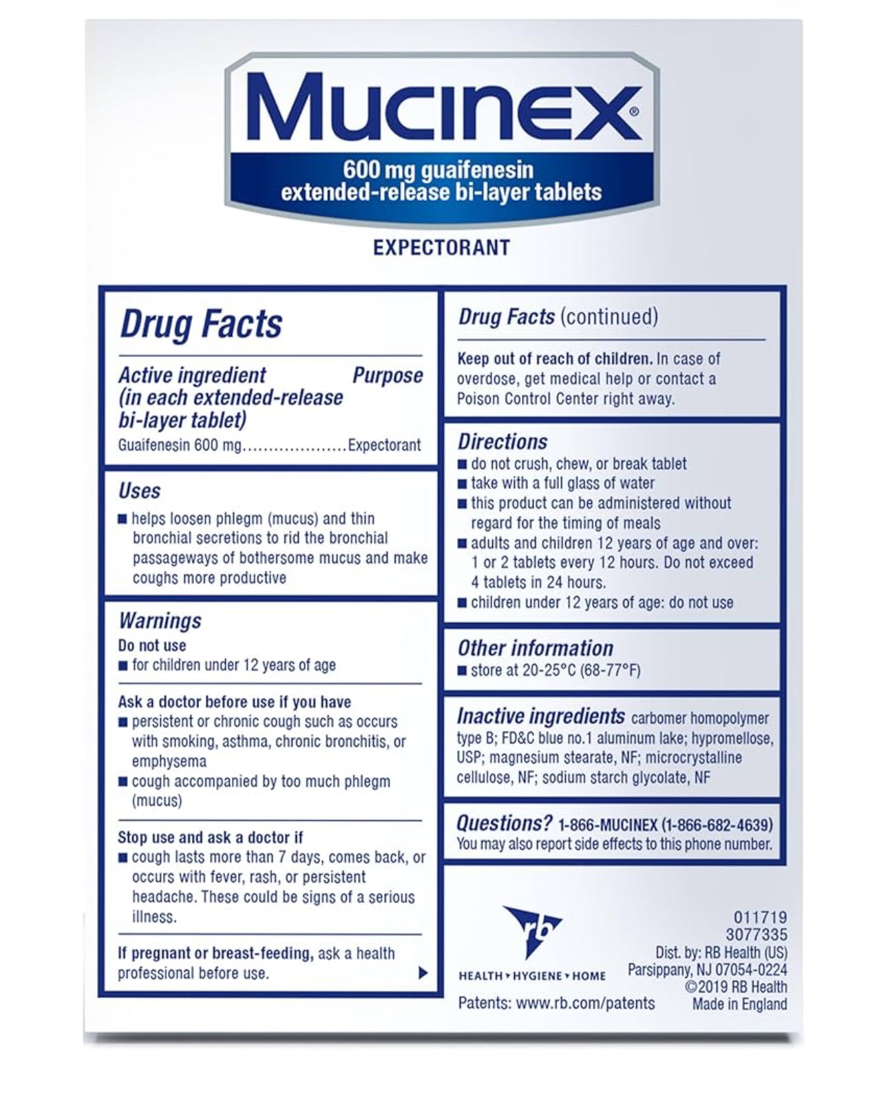 - EXCESS MUCUS RELIEF: Mucinex 12hr extended-release tablets pack a powerful punch with 600 mg guaifenesin expectorant, providing you with long-lasting chest congestion relief