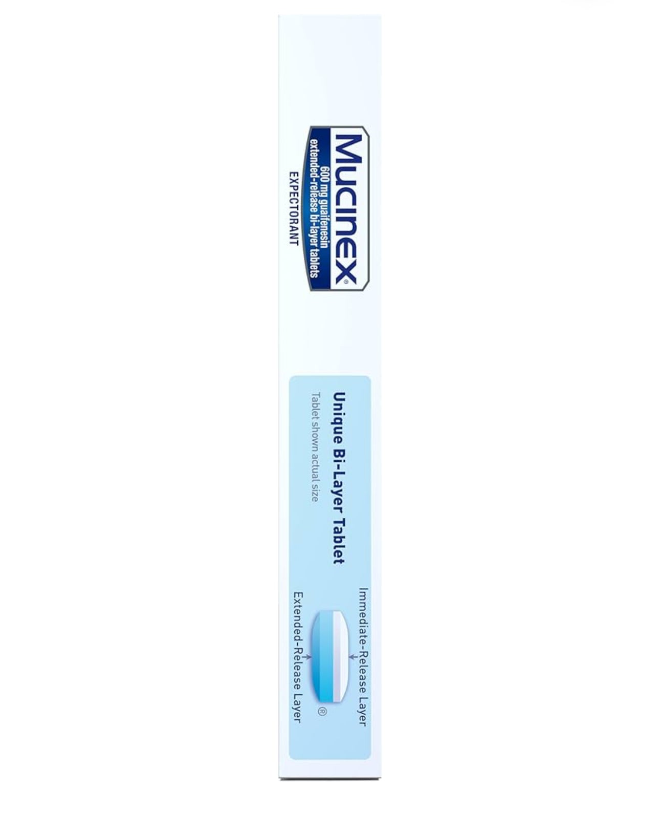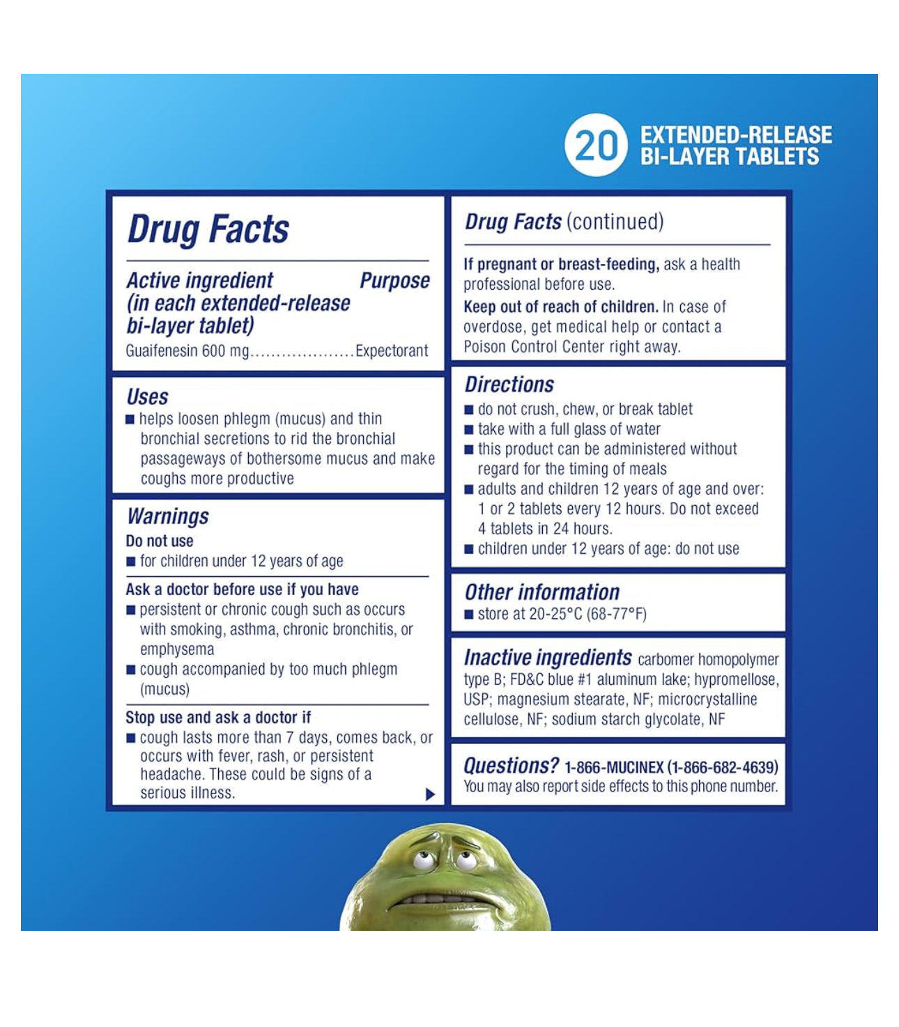 - EXTENDED RELEASE GUAIFENESIN: Experience long-lasting excess mucus relief with Mucinex's 12hr extended-release 600mg guaifenesin tablets; our original bi-layer tablets have both immediate & extended release