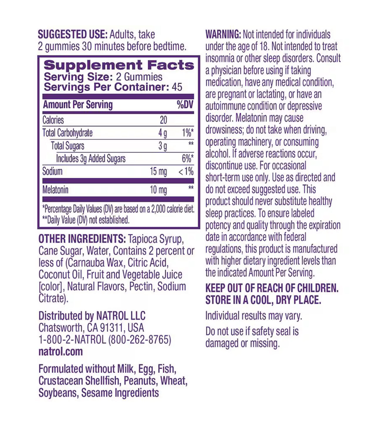 Natrol® Melatonin 10 mg gummies are sleep support for adults and offer a convenient and easy-to-take options to help with occasional sleeplessness but prefer not to take tablets.This melatonin sleep aid is 100% drug-free, made with clean ingredients, no synthetic dyes, artificial flavors or sweeteners. Each vegetarian, non-GMO and gelatin-free melatonin sleep aid gummy excludes common food allergens. Factors like stress and screen time before bed can interrupt melatonin production and disrupt your sleep. Natrol® melatonin supplements for sleeping offer 10 mg of 99% pure melatonin per serving, providing the sleep support you need to fall asleep faster and stay asleep longer. Natrol®'s pectin-based formula and great-tasting strawberry flavor make these sleep aid gummies easier to chew than standard gelatin gummies. Natrol® is dedicated to creating innovative, quality products, to help you maintain good health and thrive in your busy, modern lifestyle. Fall asleep faster, stay asleep longer