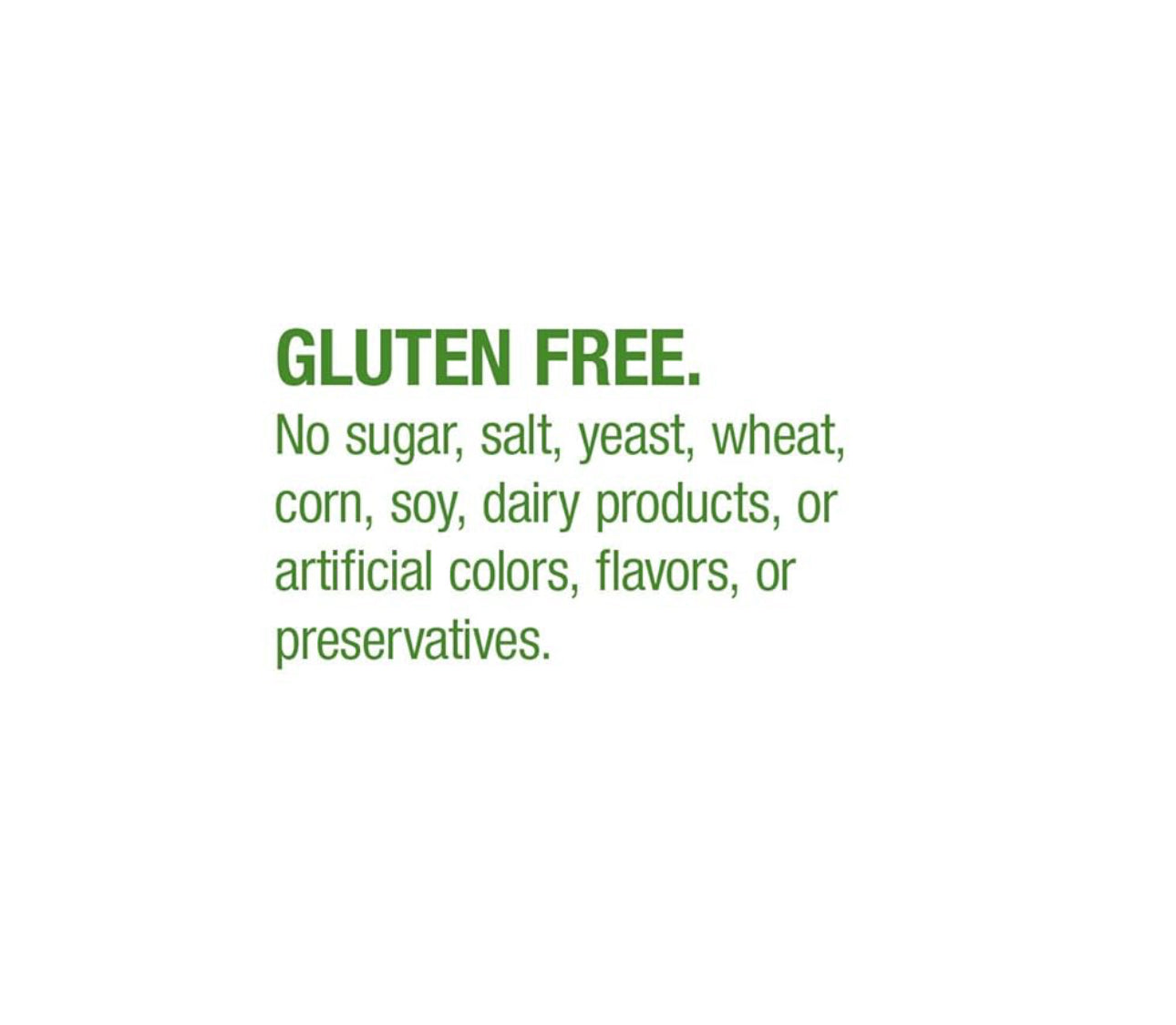 - Gluten-free and vegan. No salt, wheat, soy, corn, dairy, gelatin, or artificial colors, flavors, or preservatives. Contains tree nuts (walnut.) Non-GMO Project Verified.