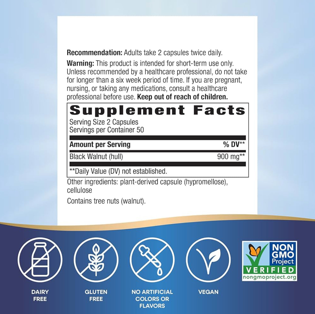 Nature's Way Black Walnut Hulls 900 mg per 2-Capsule Serving | Traditional Digestive Tract Tonic | 100 Capsules; Exp 11/2029