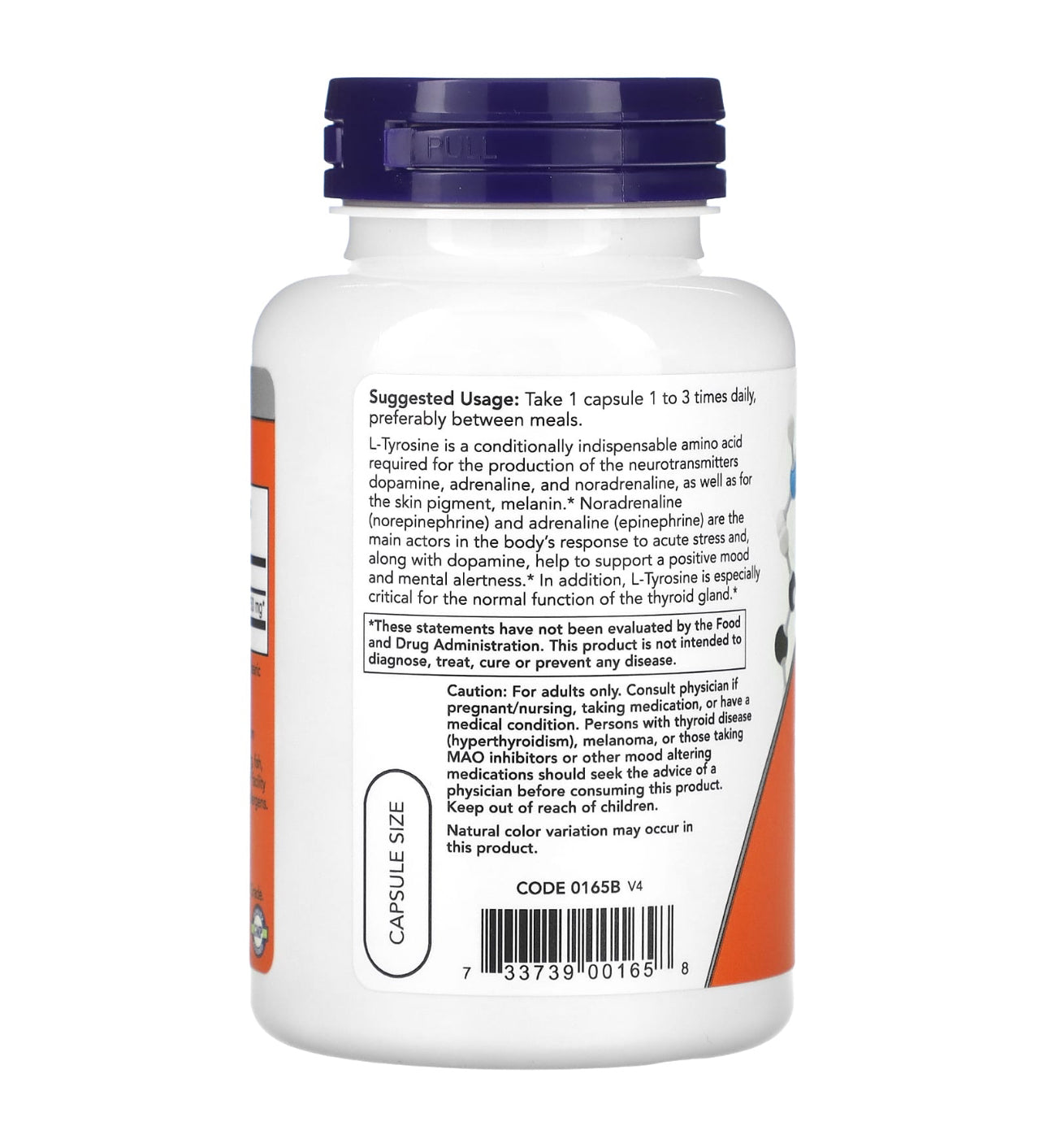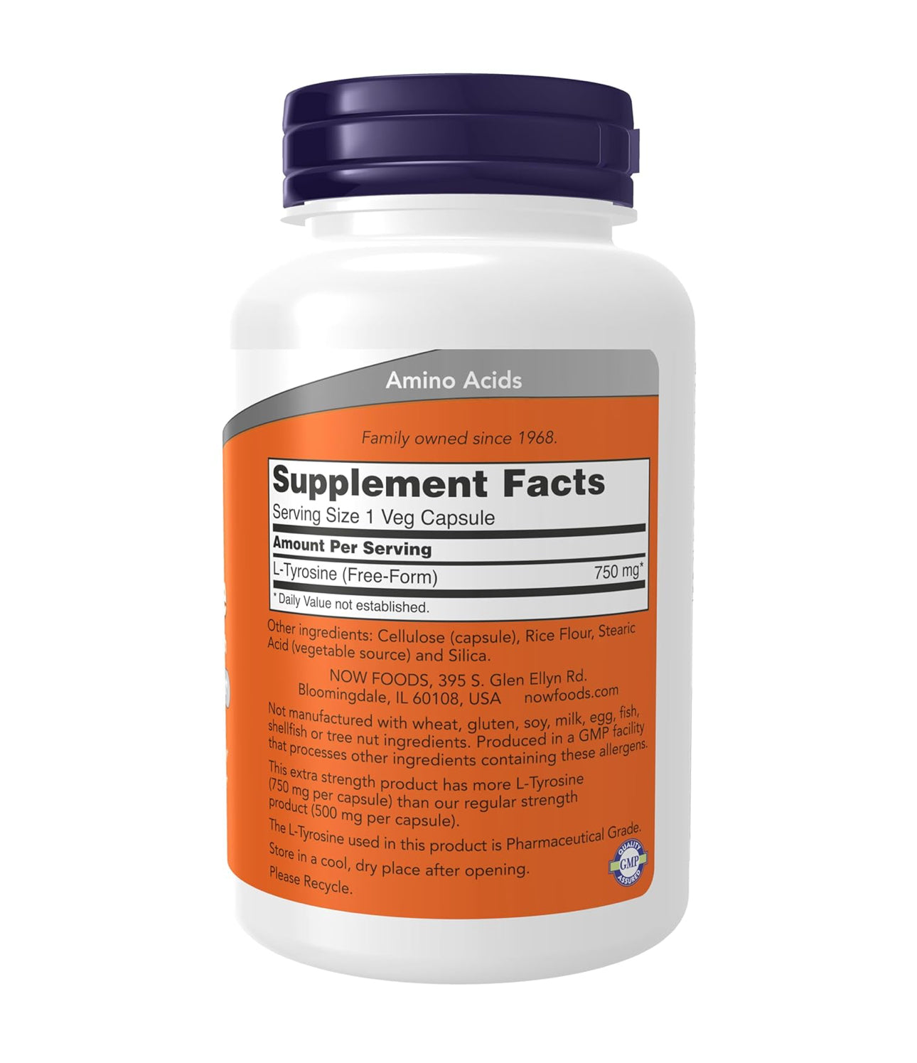 Now L-Tyrosine 750mg - Extra Strength | Supports Mental Alertness & Healthy Glandular Function | Neurotransmitter Support | 90 Capsules; Exp 01/2029