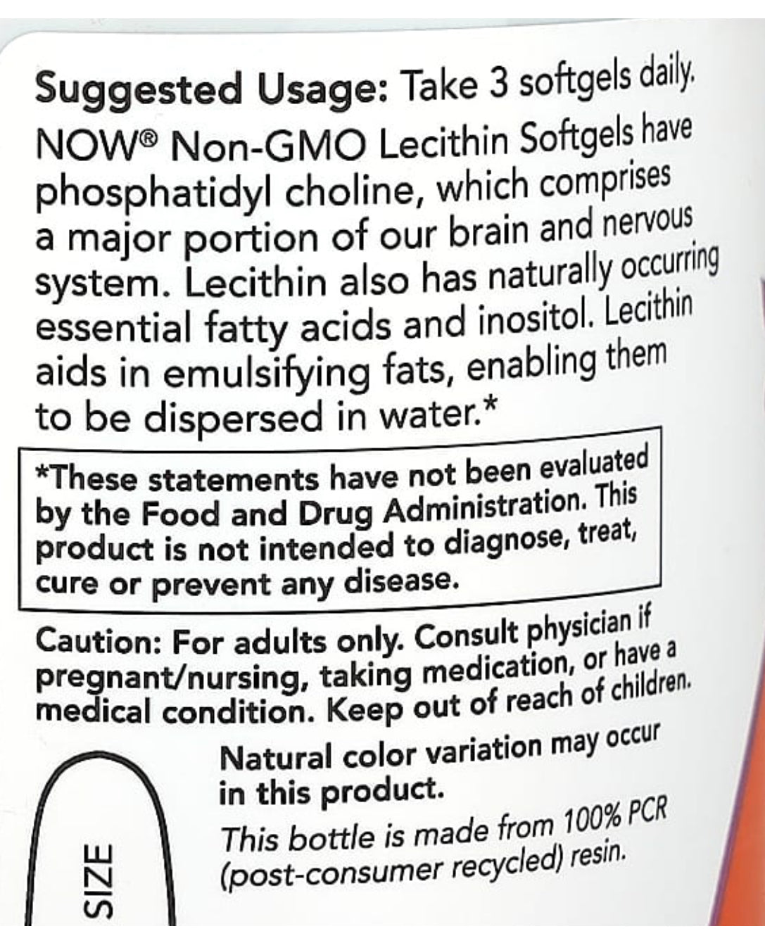 NOW® Non-GMO Lecithin Softgels have phosphatidyl choline, which comprises a major portion of our brain and nervous system. Lecithin also has naturally occurring essential fatty acids and inositol. Lecithin aids in emulsifying fats, enabling them to be dispersed in water.