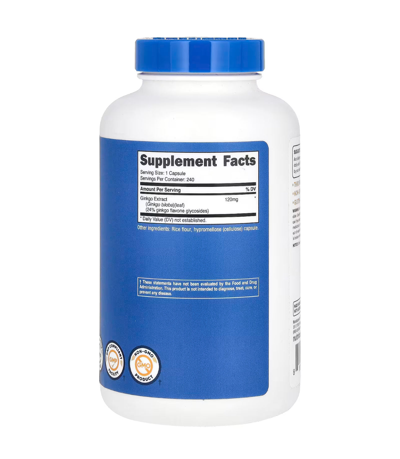Nutricost Ginkgo Biloba contains 120 MG of potent, high-quality Ginkgo per serving. This product is non-GMO and gluten-free.