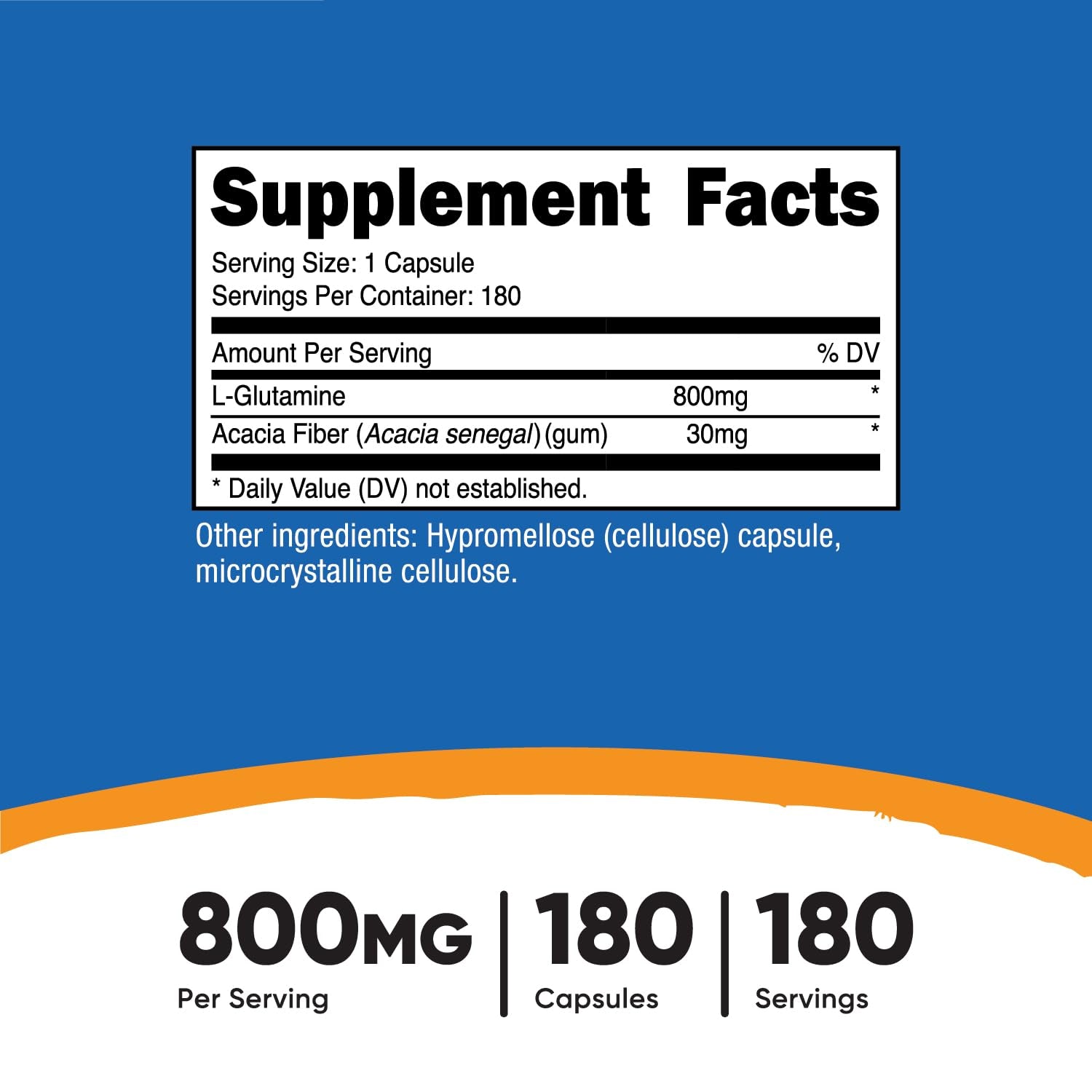 Nutricost L-Glutamine 800mg | 180 Servings | Supports Muscle Growth and Recovery, Digestive Health and Provides Fuel for Activity | 180 Capsules; Exp 11/2026