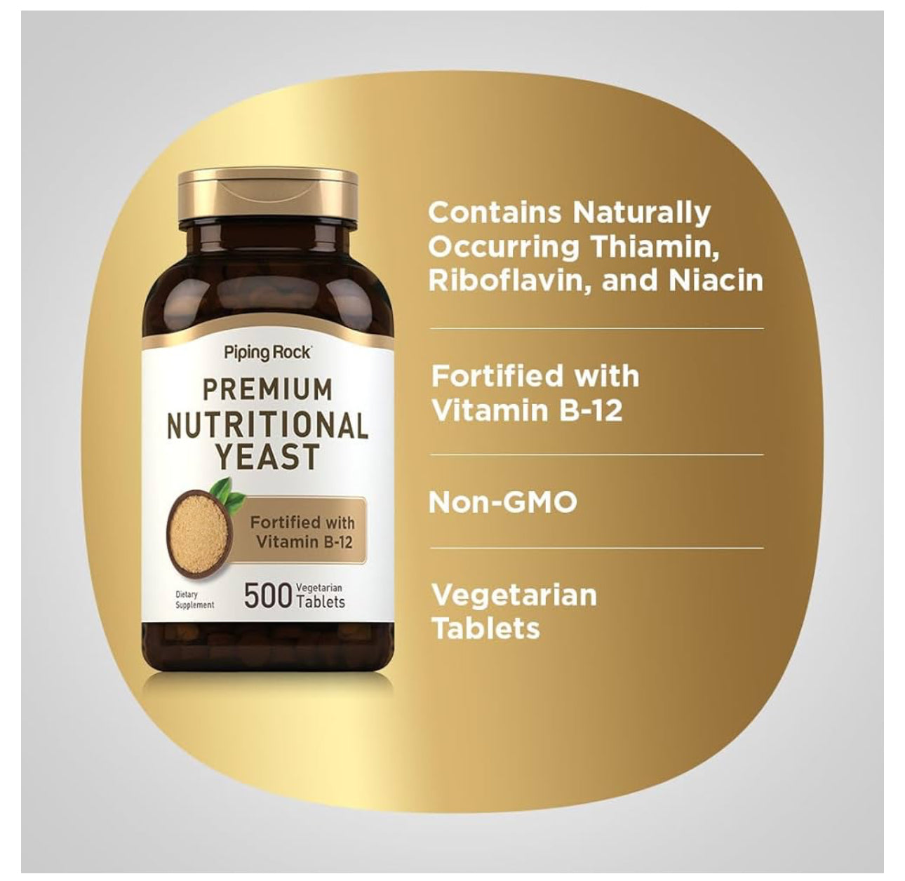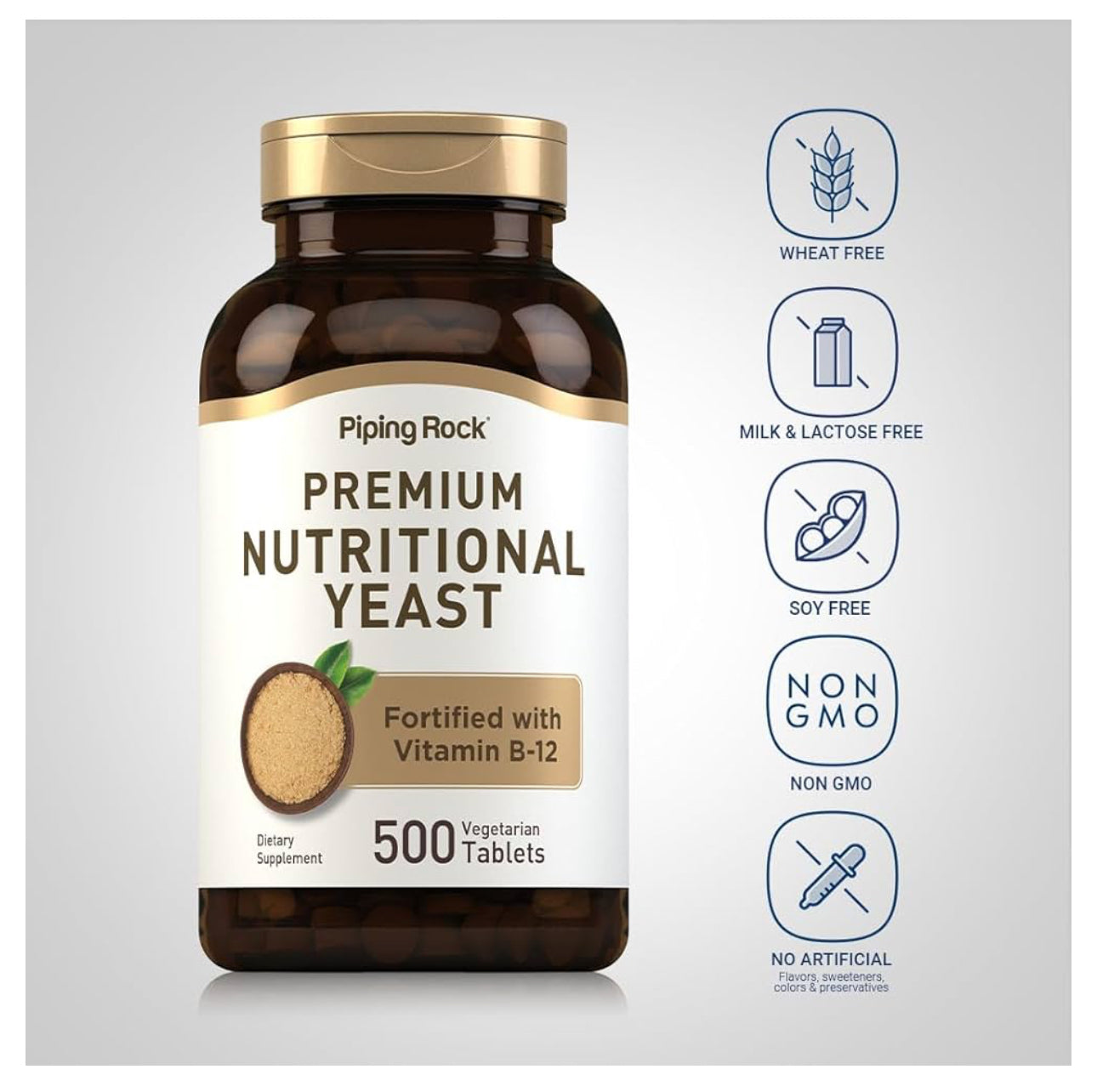 PipingRock Nutritional Yeast 2000mg Fortified with Vitamin B12 | Naturally Contains Thiamine (Vitamin B-1), Riboflavin (Vitamin B-2) & Niacin | 500 Tablets; Exp 08/2027