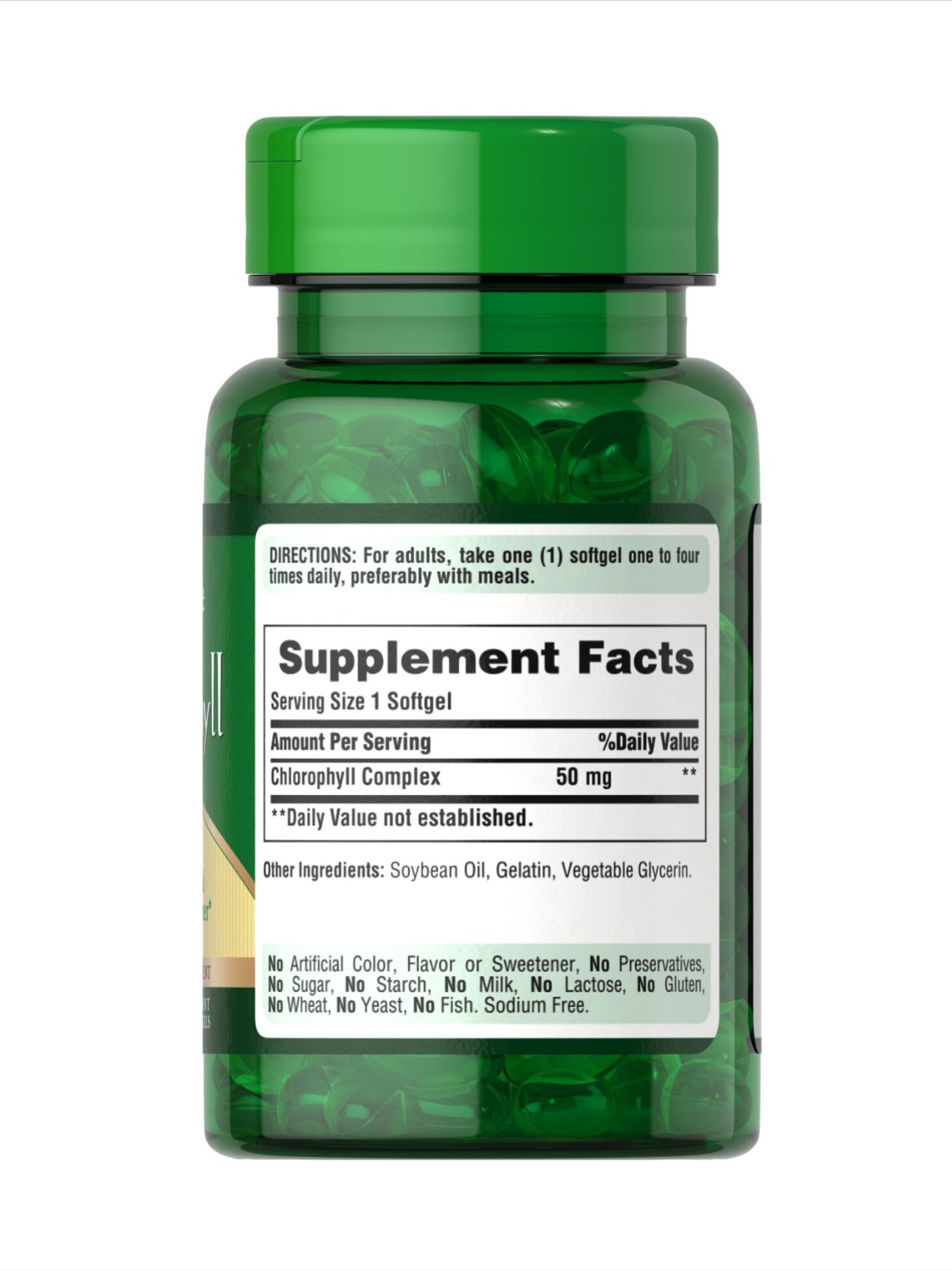 Puritan’s Pride Chlorophyll Concentrate softgels are designed to be your internal freshening system. Chlorophyll, the green pigment that gives most plants their color, is considered one of life's most precious elements. Our chlorophyll is extracted from alfalfa and manufactured with care so you can be assured of a superior concentrate that meets your standard of excellence.