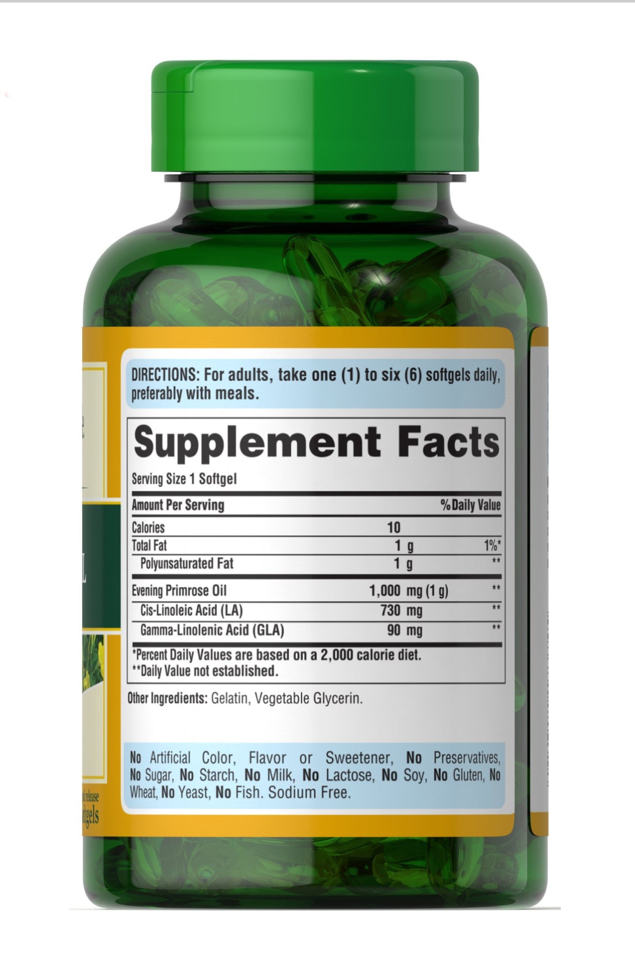 Evening primrose oil may play a role in promoting smooth, healthy-looking skin. These easy-to-swallow softgels are a natural source of GLA (Gamma Linolenic Acid). These EPO contains one of the most concentrated forms of this Omega-6 fatty acid available today. The EPO used for Puritan’s Pride is 100% pure, solvent-free, cold pressed and void of hexane and other solvent residues.