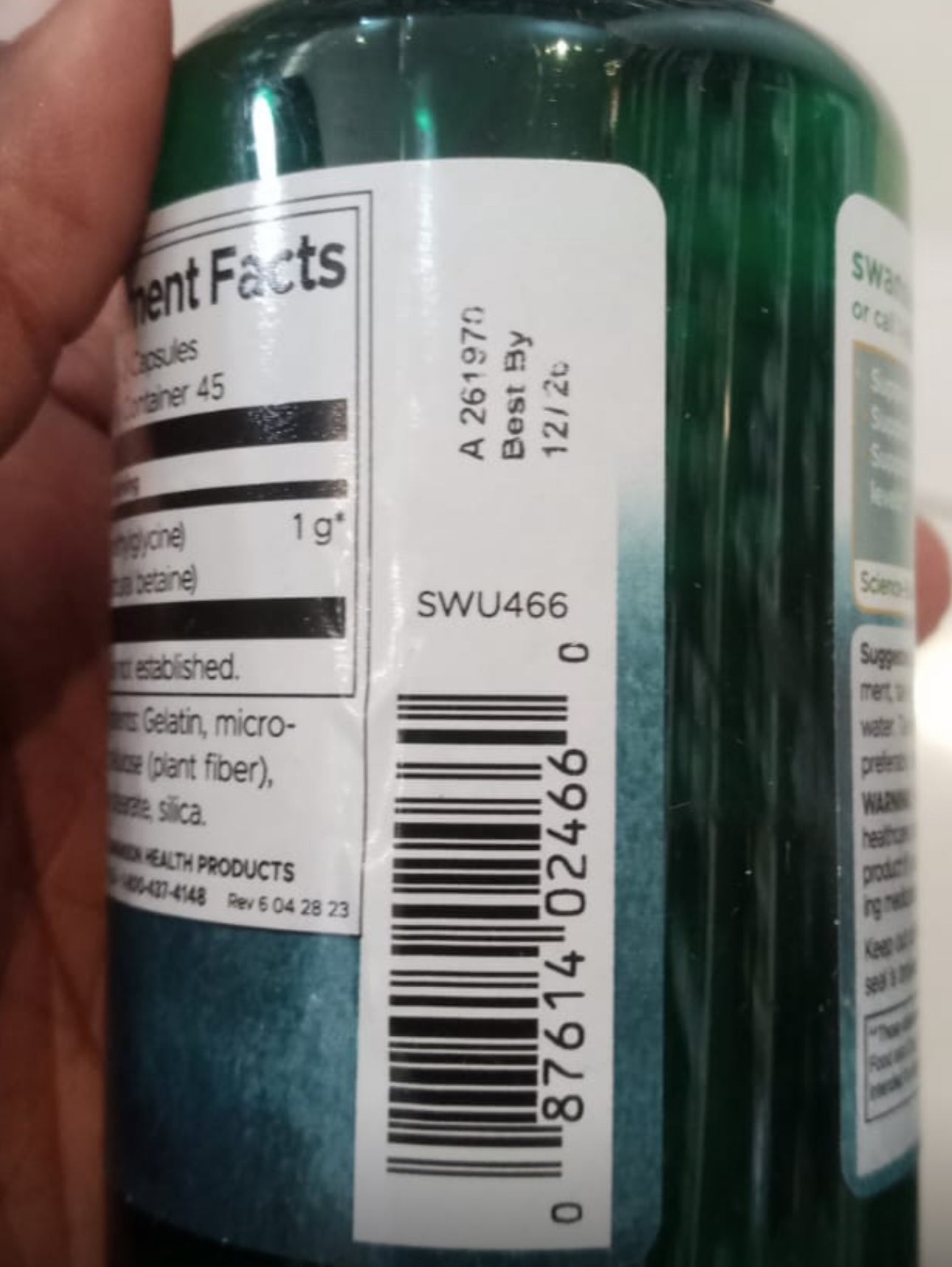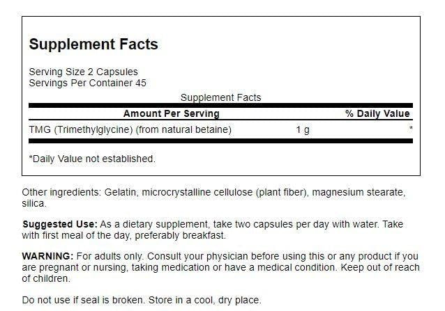 Swanson Trimethylglycine (TMG) 500mg | Betaine Anhydrous | Supports Detoxification | Promotes Healthy Liver Function & Normal Homocysteine Levels | 90 Capsules; Exp 09/2026