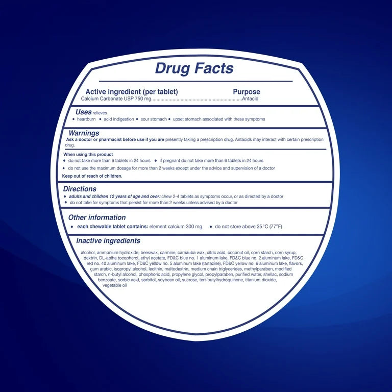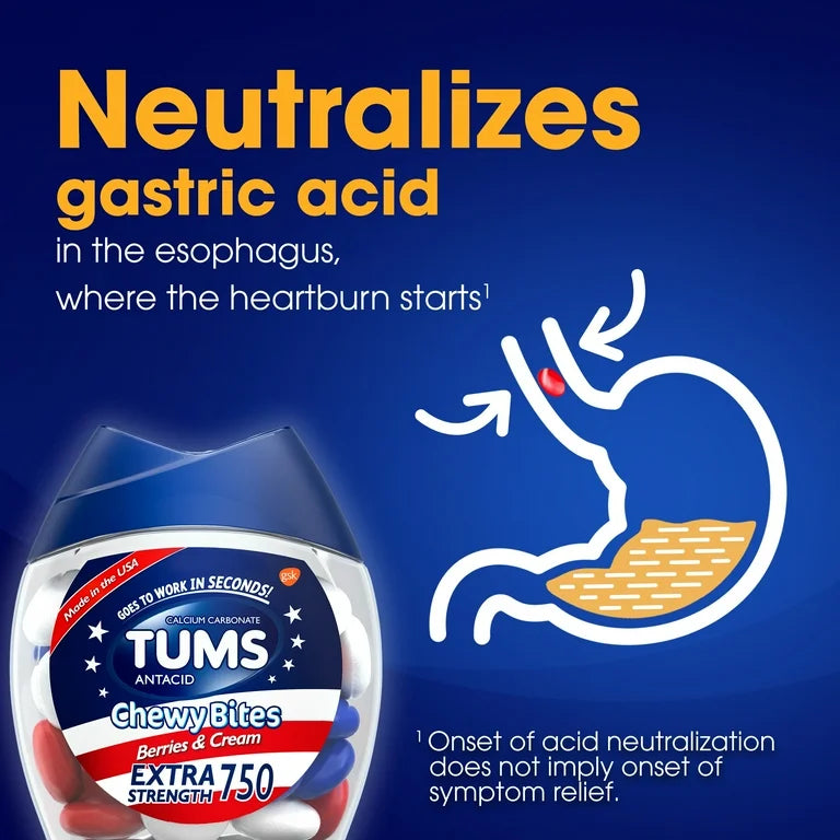 TUMS Chewy Bites Chewable Antacid Tablets go to work in seconds to make heartburn relief simple and delicious. When symptoms occur, take two to four chewable antacids, depending on the severity of your acid indigestion. Featuring the active ingredient calcium carbonate, these chewy antacid tablets relieve heartburn, sour stomach, acid indigestion and provide upset stomach relief associated with these symptoms. Each chewable antacid tablet delivers fast relief in every bite. With a delicious outer shell and soft center, these TUMS Chewy Bites come in three delicious assorted berry flavors. TUMS is the #1 recommended adult antacid brand by doctors, pharmacists and OBGYNs. As America's #1 antacid and trusted as a heartburn medicine for 90 years, TUMS is fully supported with a satisfaction guarantee. These calcium carbonate tablets are gluten free. These heartburn and acid indigestion relief tablets come in a compact, recyclable bottle that's easy to stow for whenever heartburn strikes. With TUMS Chewy Bites, you get a tasty way to fast heartburn relief in every chewy bite.