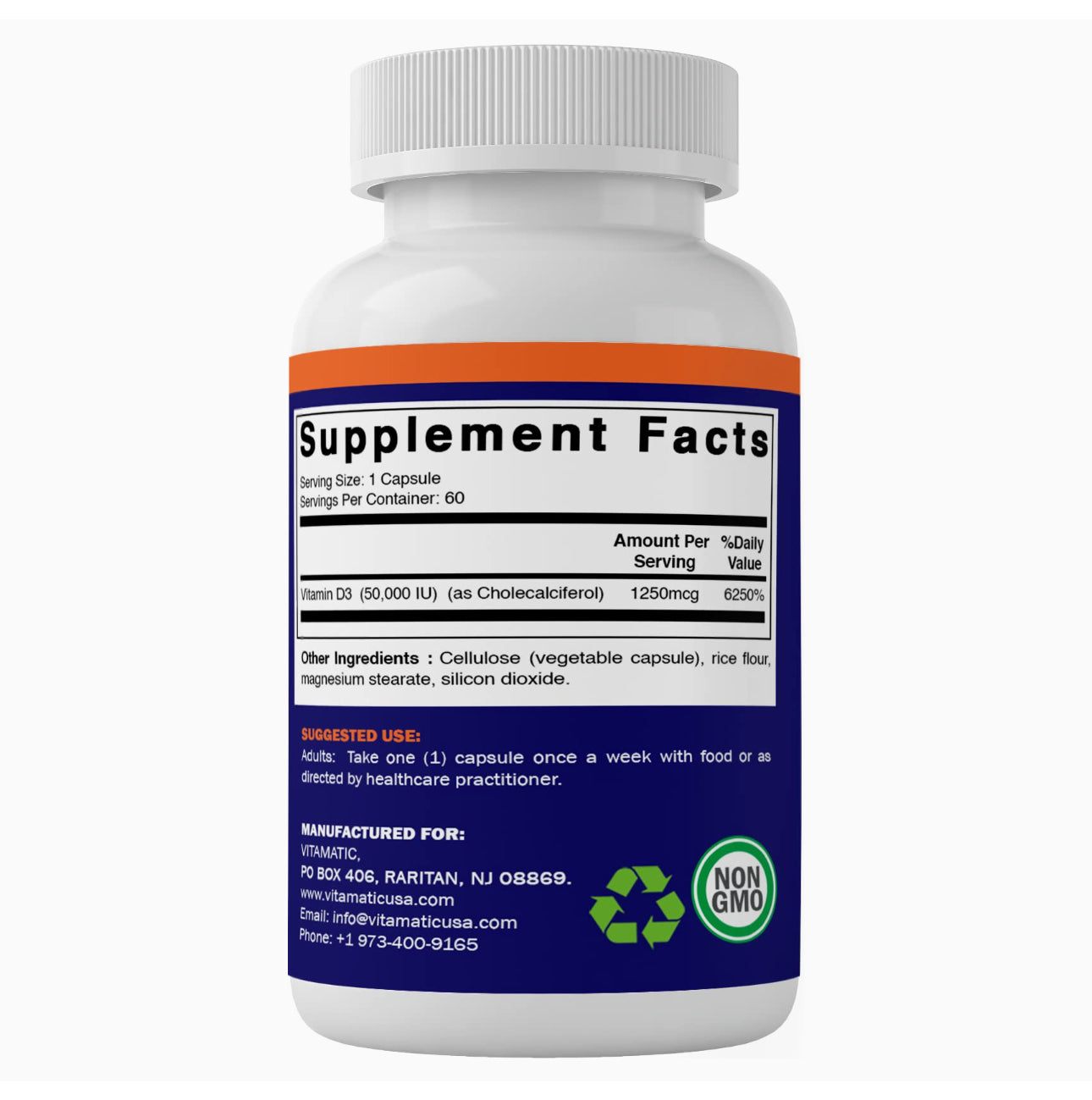 Vitamatic Vitamin D3 50,000 IU (as Cholecalciferol) | Once Weekly Dose, 1250 mcg | 1 Year Supply | Progressive Formula Helping Vitamin D Deficiencies | 60 Veggie Capsules Exp 12/2026